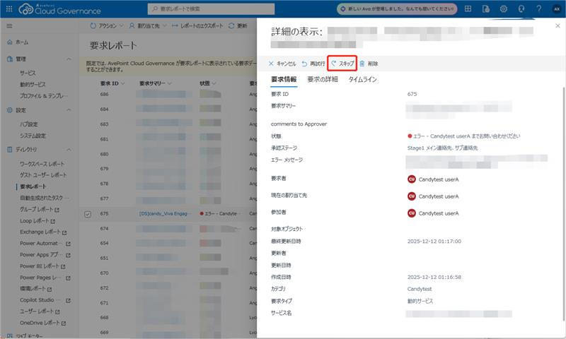 1. 対象申請のエラー タスクに対して [スキップ] 操作を実行します。
