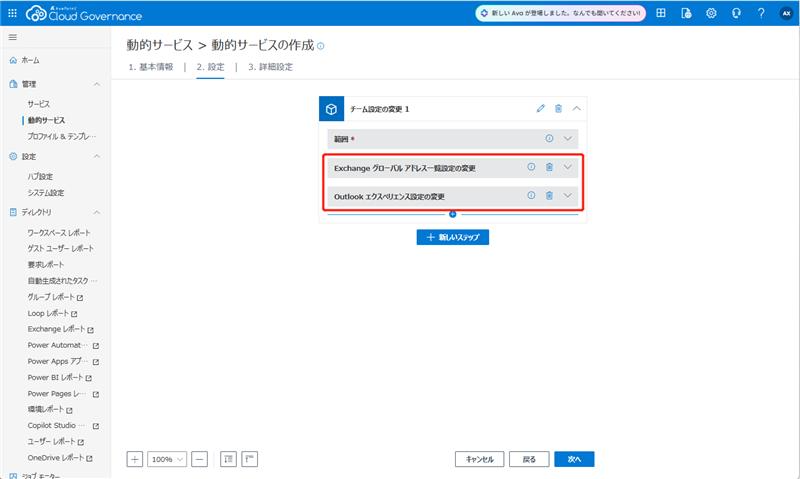 2. Microsoft 側より MS API の動作異常の修正がされた後に、申請サービスの編集画面より [Exchange グローバル アドレス一覧設定] と [Outlook エクスペリエンス] を再度設定します。