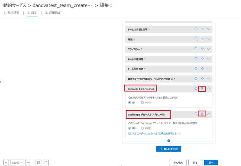 1. チーム・グループ・コミュニティ作成サービスにおいて、[Outlook エクスペリエンス] 及び [Exchange グローバル アドレス一覧] の設定を一旦削除し、保存します。