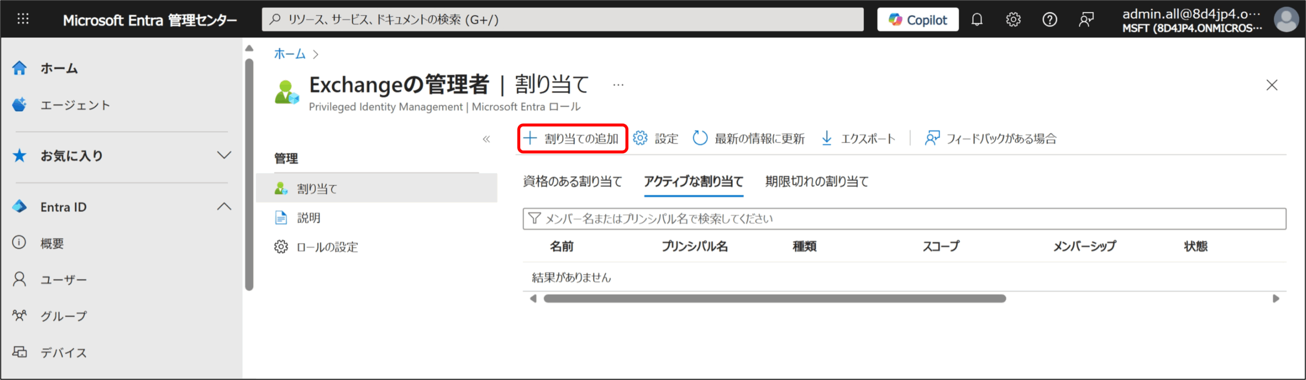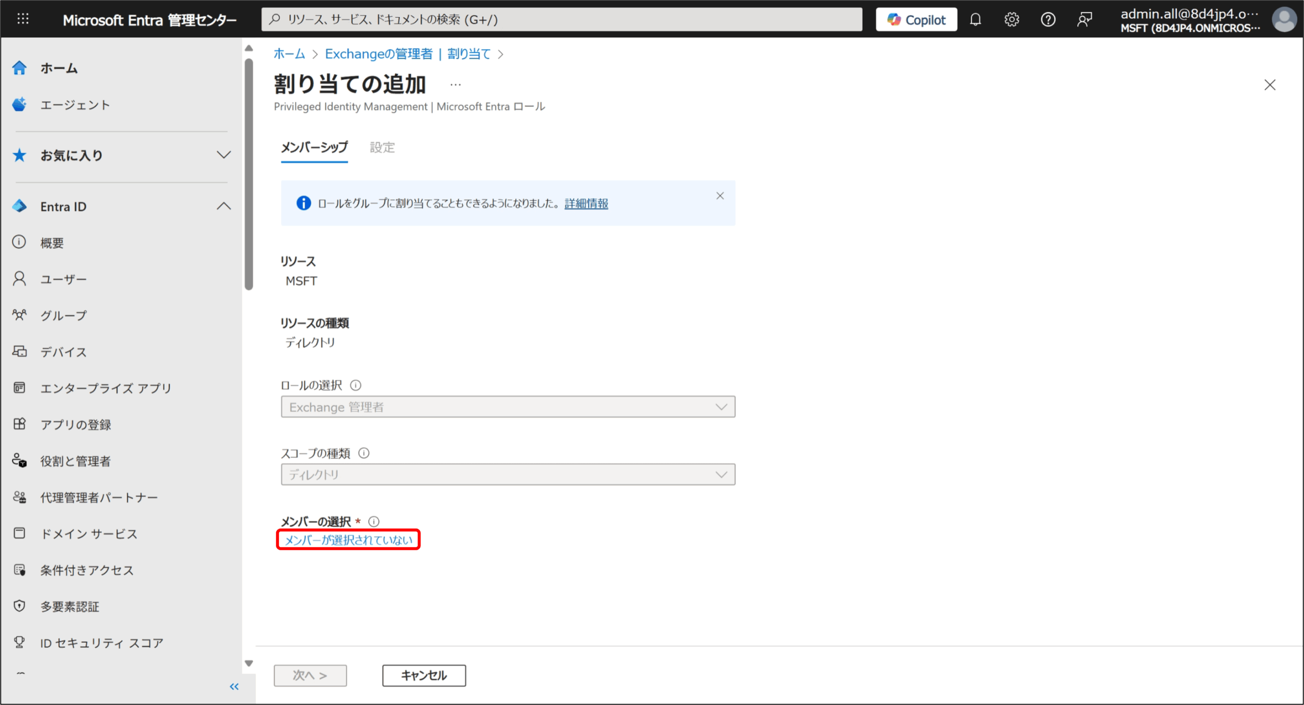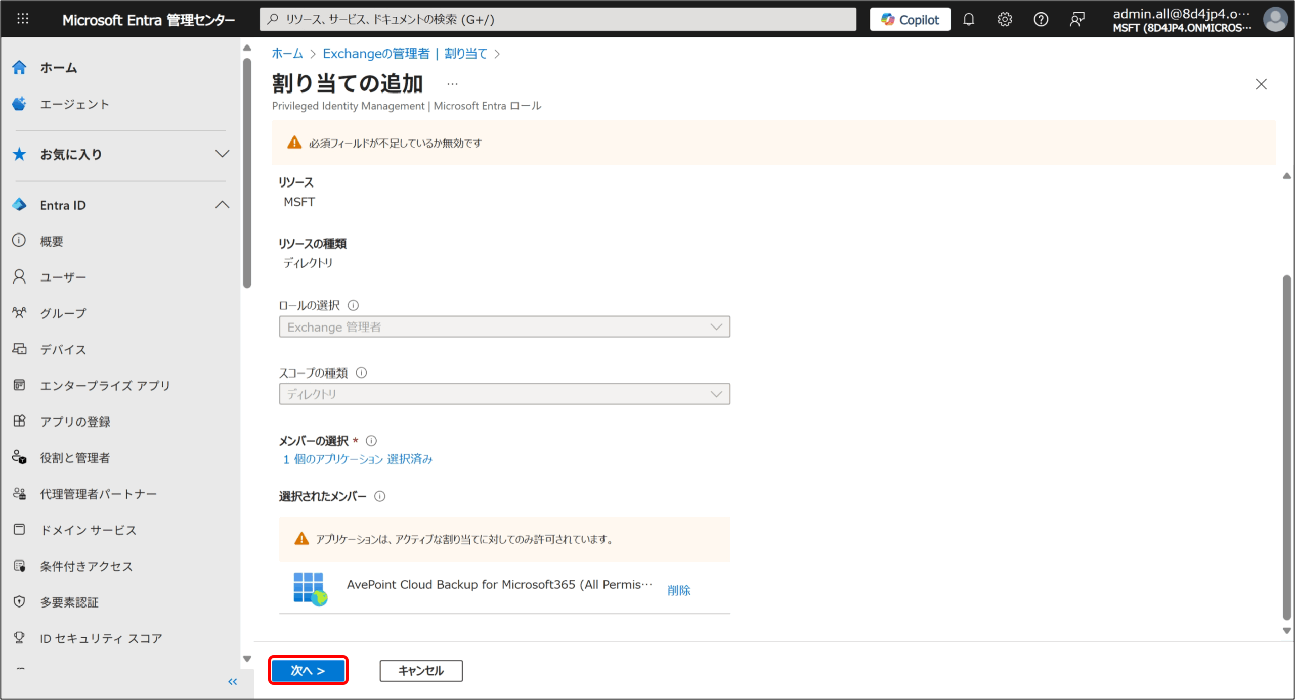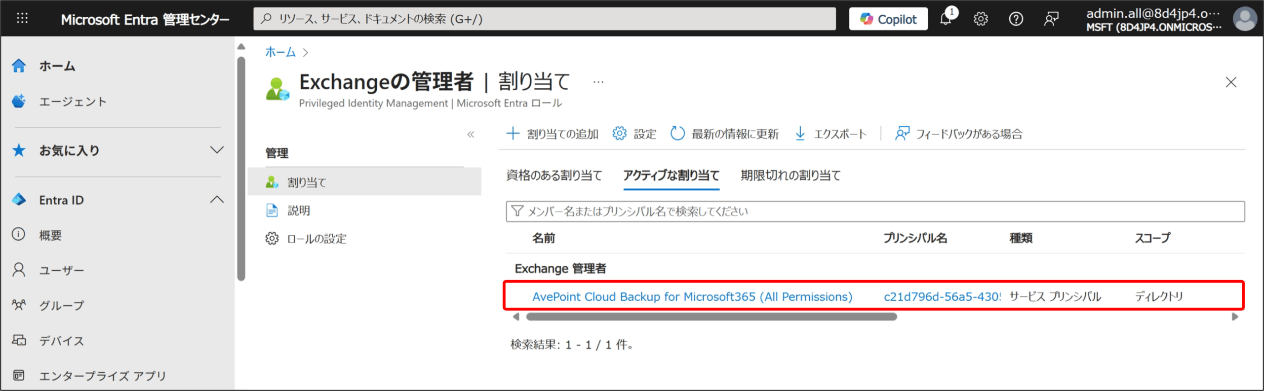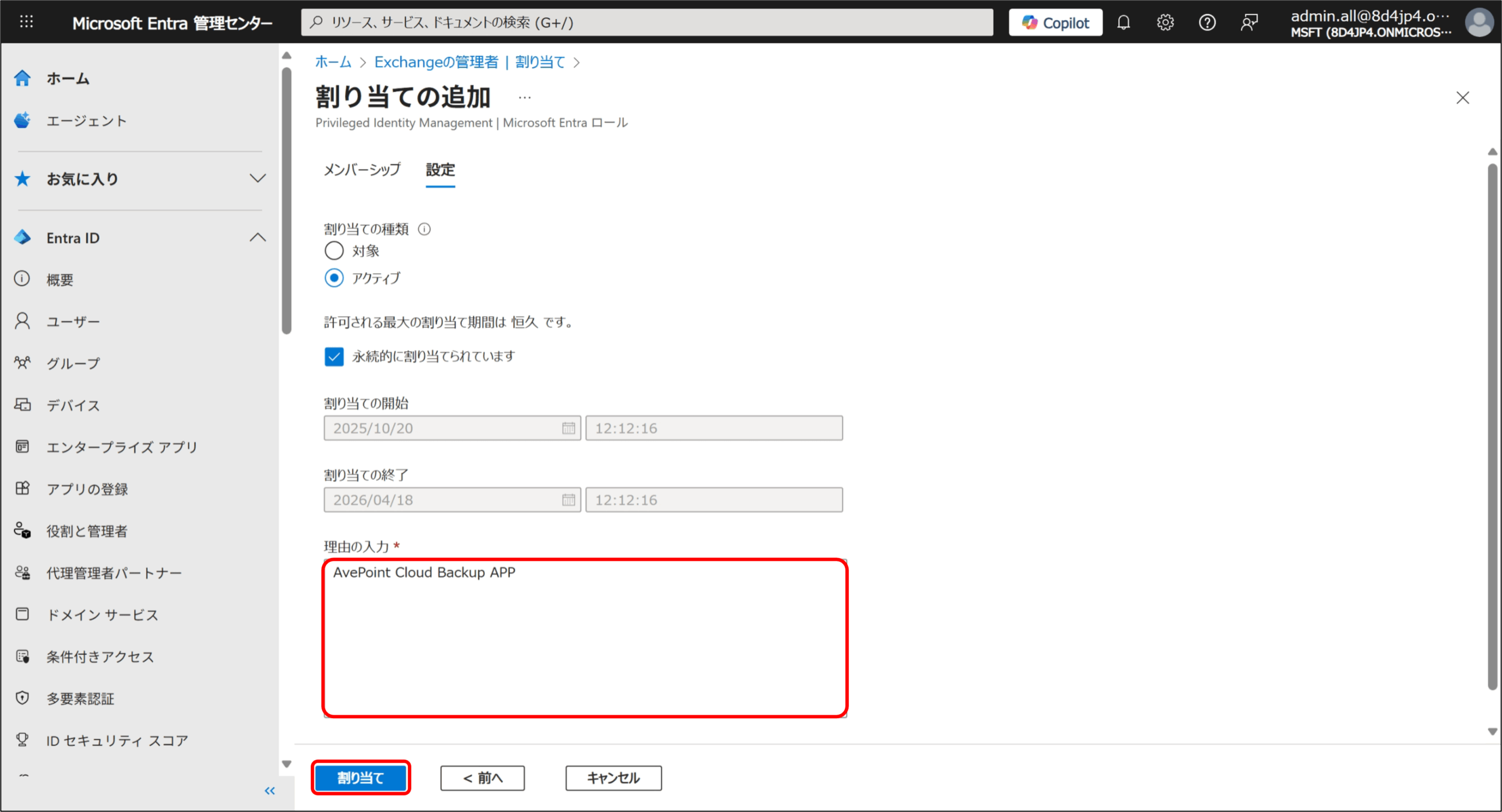 下記は Cloud Backup for Microsoft 365 (すべての権限) に Exchangeの管理者 ロールを割り当てる方法の設定例です。