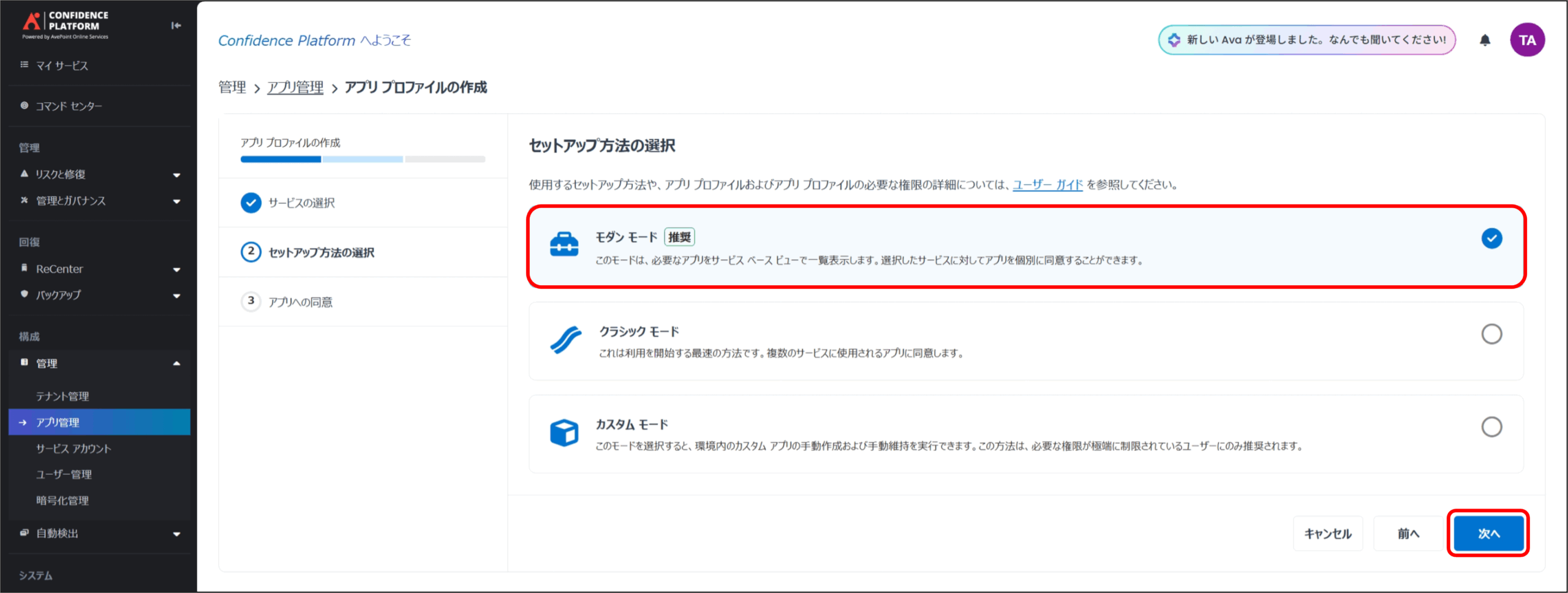 4.セットアップ方法の選択 画面が表示されるので、[モダン モード] を選択し、[次へ] をクリックします。