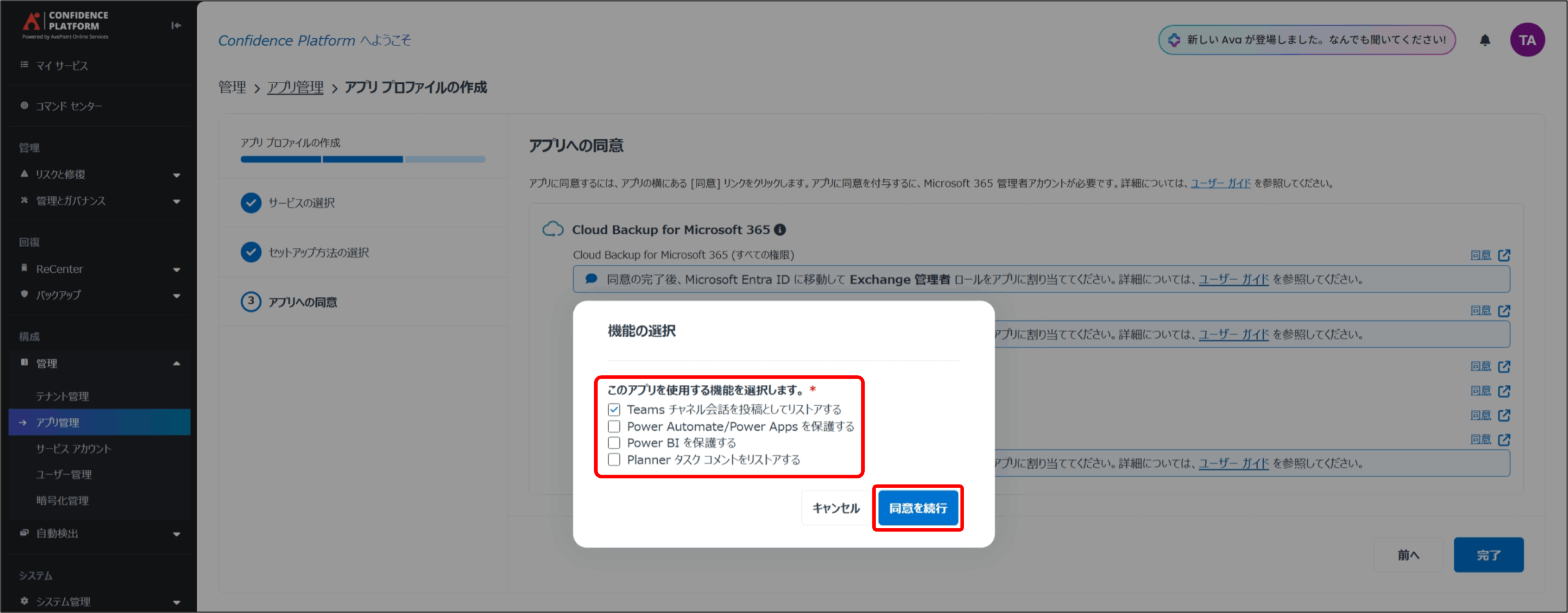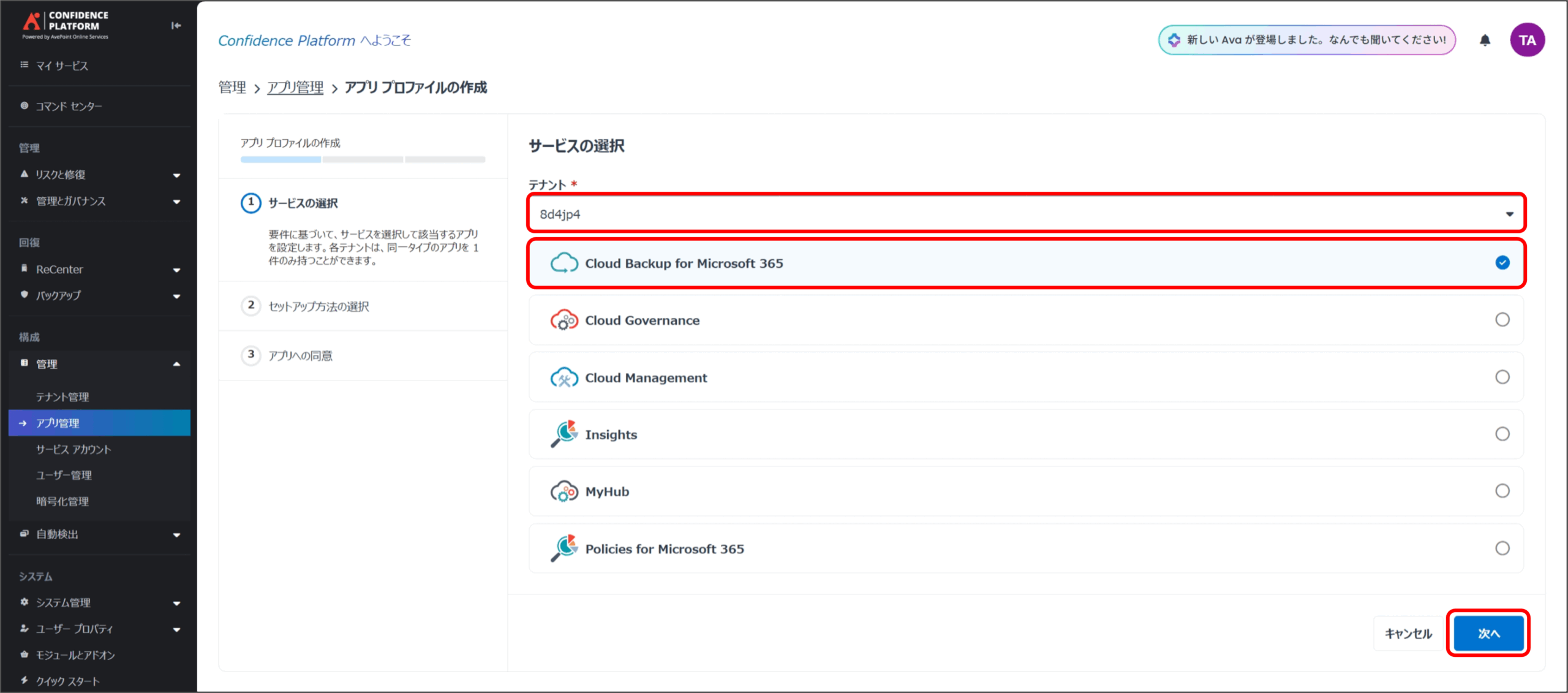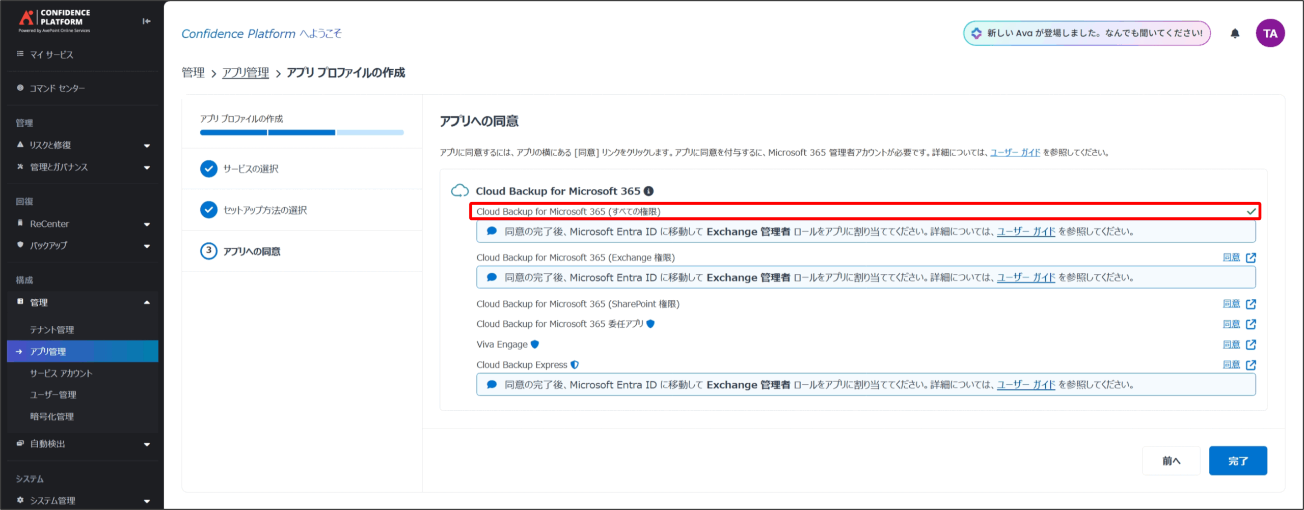 下記は Cloud Backup for Microsoft 365 のアプリプロファイル作成を例として説明しています。