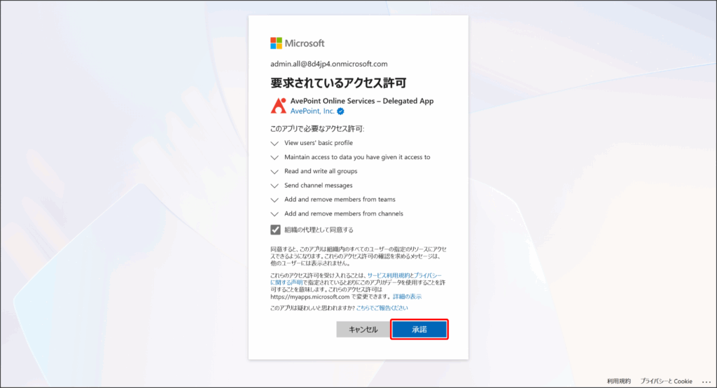 8.要求されているアクセス許可 画面が表示されるので、権限を確認して、[承諾] をクリックします。