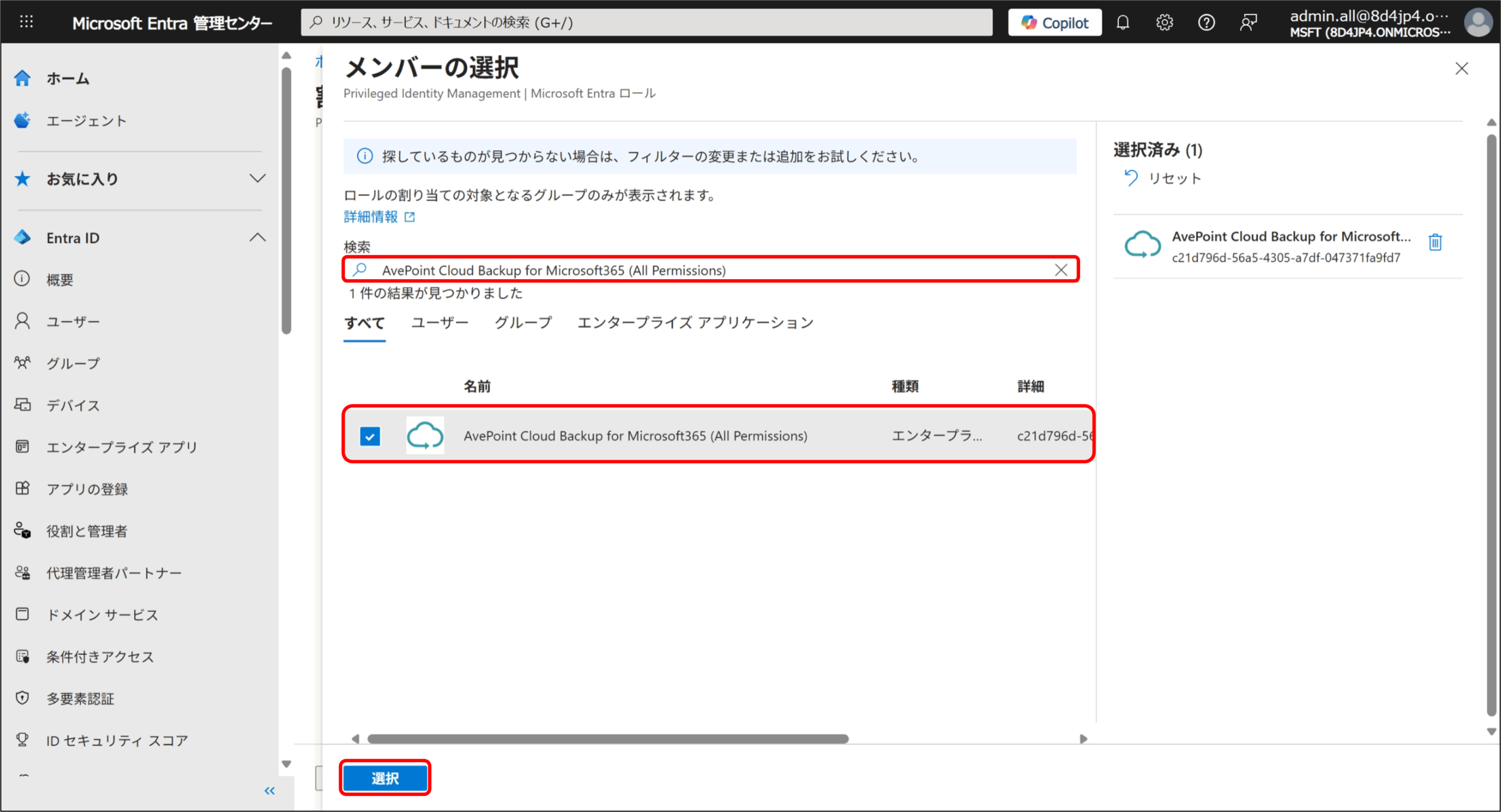 5.メンバーの選択 画面が表示されるので、検索 に [AvePoint Cloud Backup for Microsoft365 (All Permissions)] と入力して検索結果を選択し、[選択] をクリックします。