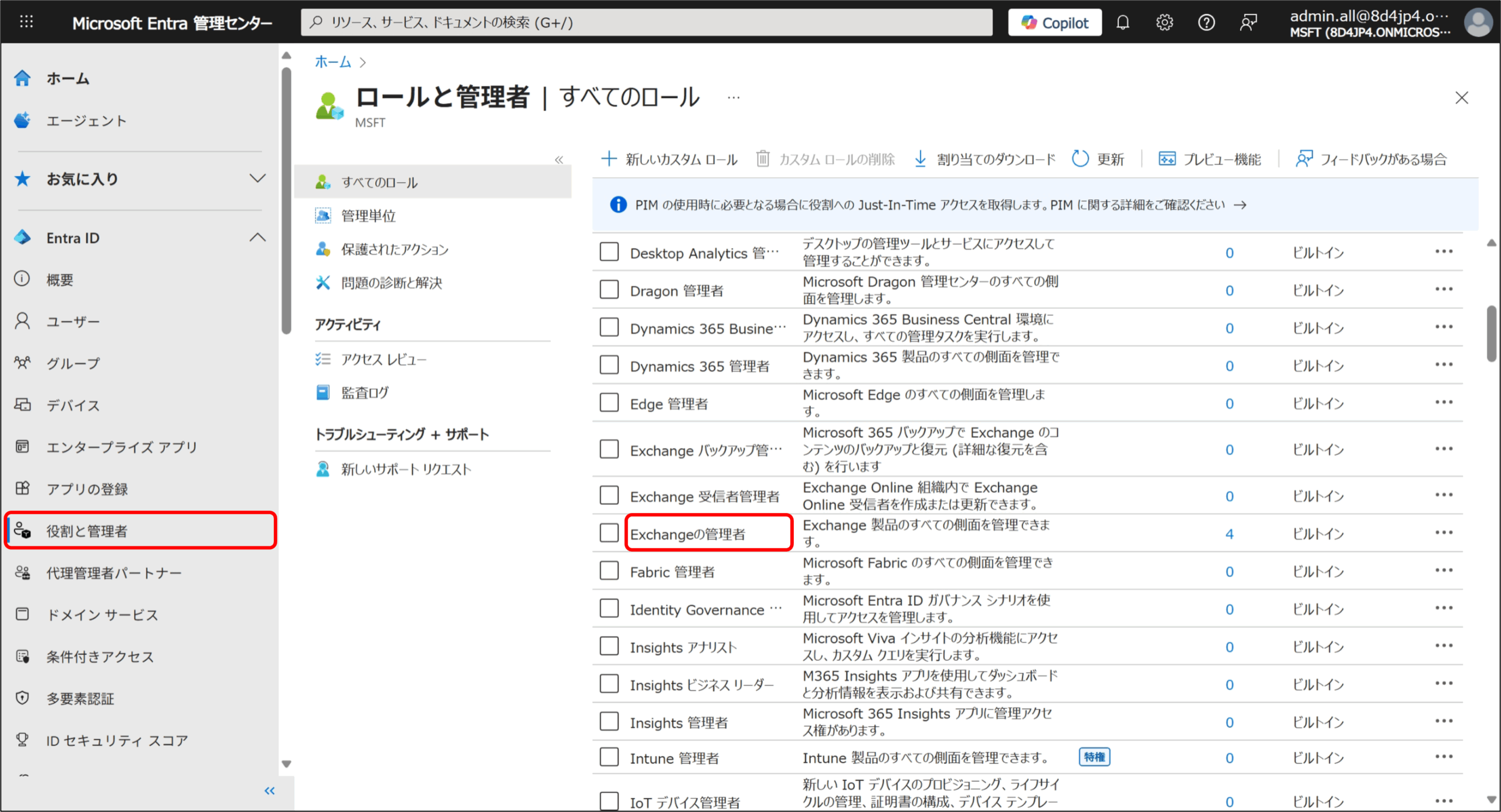 2.[役割と管理者] をクリックし、[ロールと管理者] 一覧画面を表示し、画面をスクロールして [Exchangeの管理者] ロール名をクリックします。