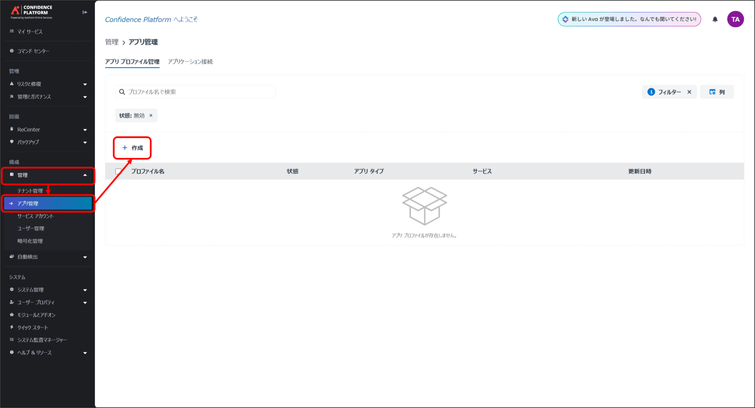 2.[管理] > [アプリ管理] にアクセスして、[+ 作成] をクリックします。
