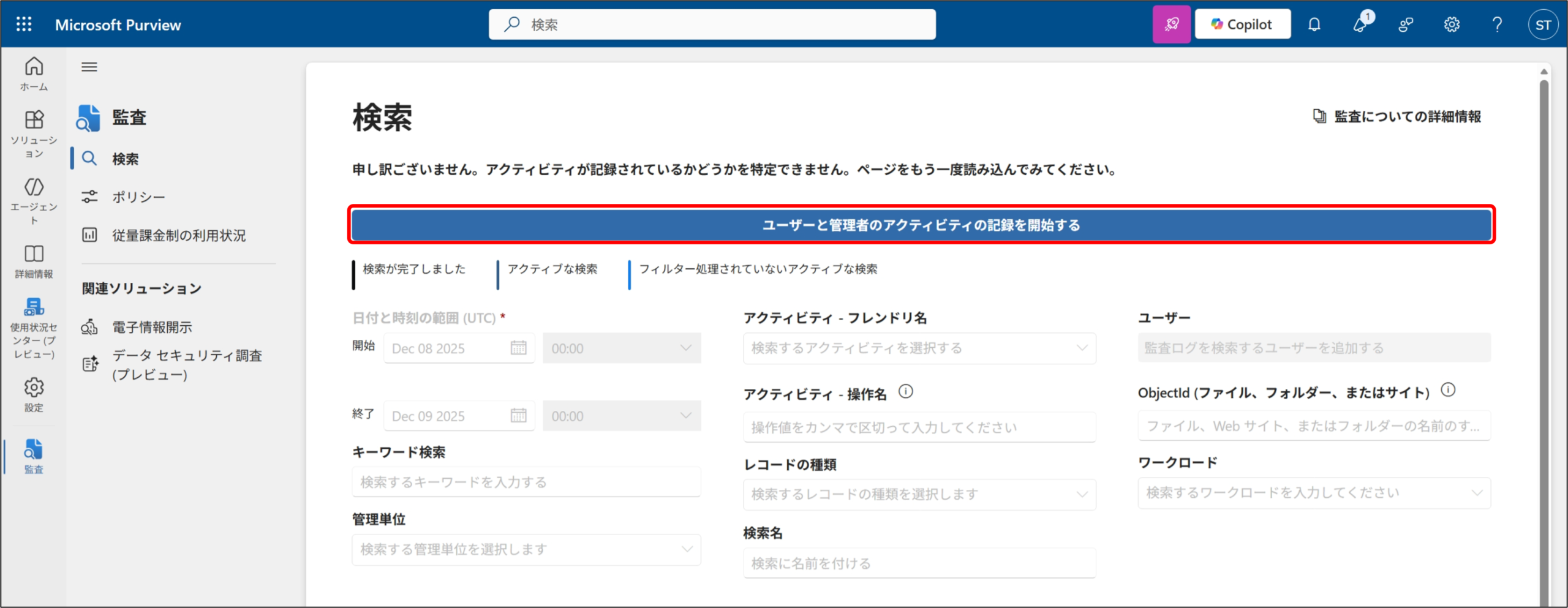 3.監査ログ検索 画面が表示されるので、[ユーザーと管理者のアクティビティの記録を開始する] をクリックします。