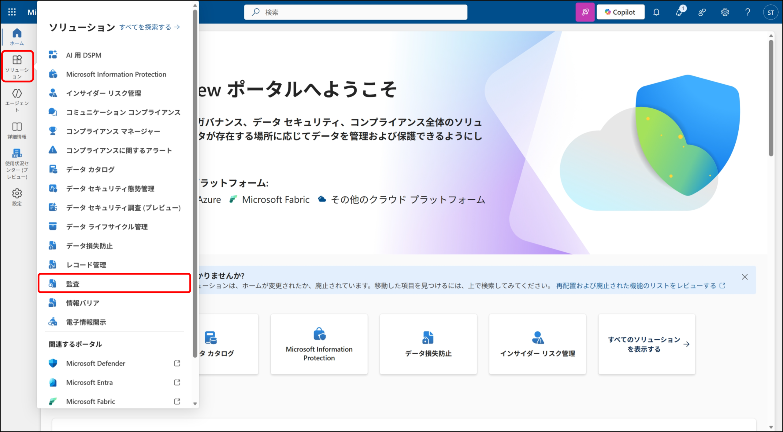 2.メニューから [ソリューション] から [監査] をクリックします。