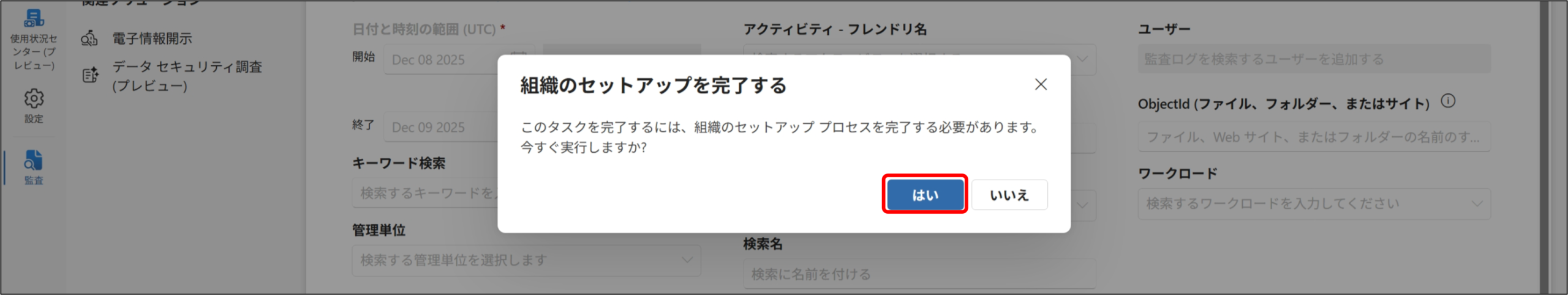 4.組織のセットアップを完了する ポップアップが表示されるので、[はい] をクリックします。