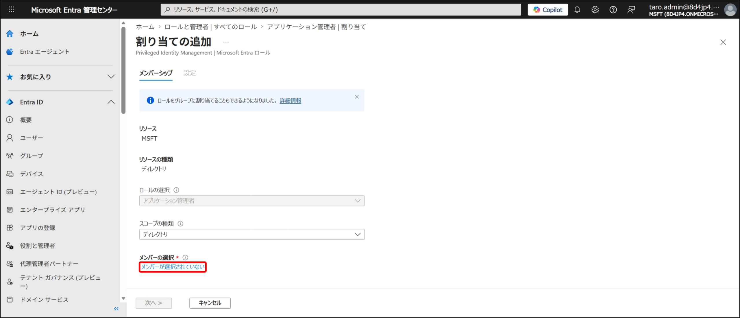 4. 割り当ての追加 画面が表示されるので、[メンバーが選択されていない] をクリックします。