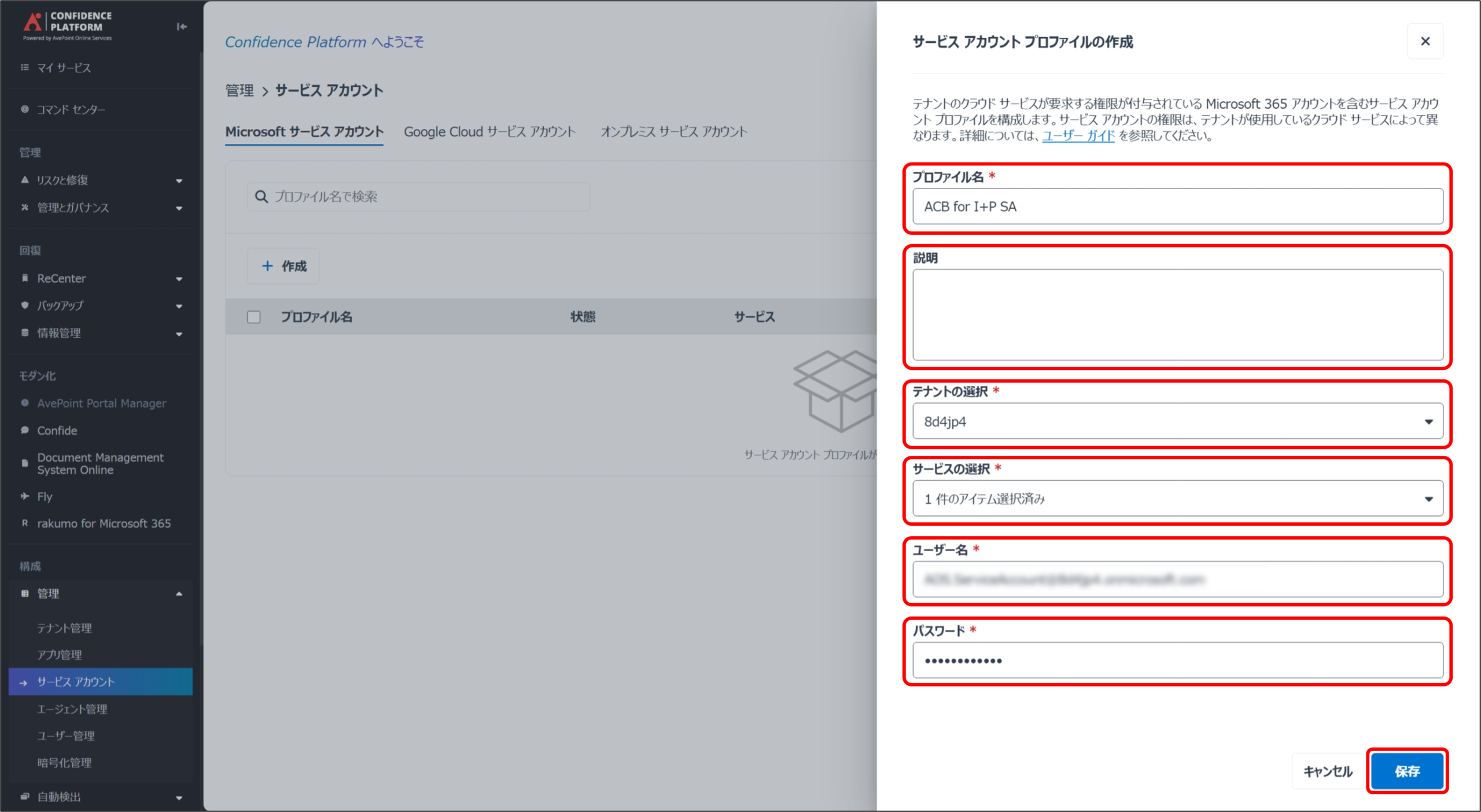 3. サービス アカウント プロファイルの作成 画面が表示されるので、下記項目に任意の設定を実施して [保存] をクリックします。