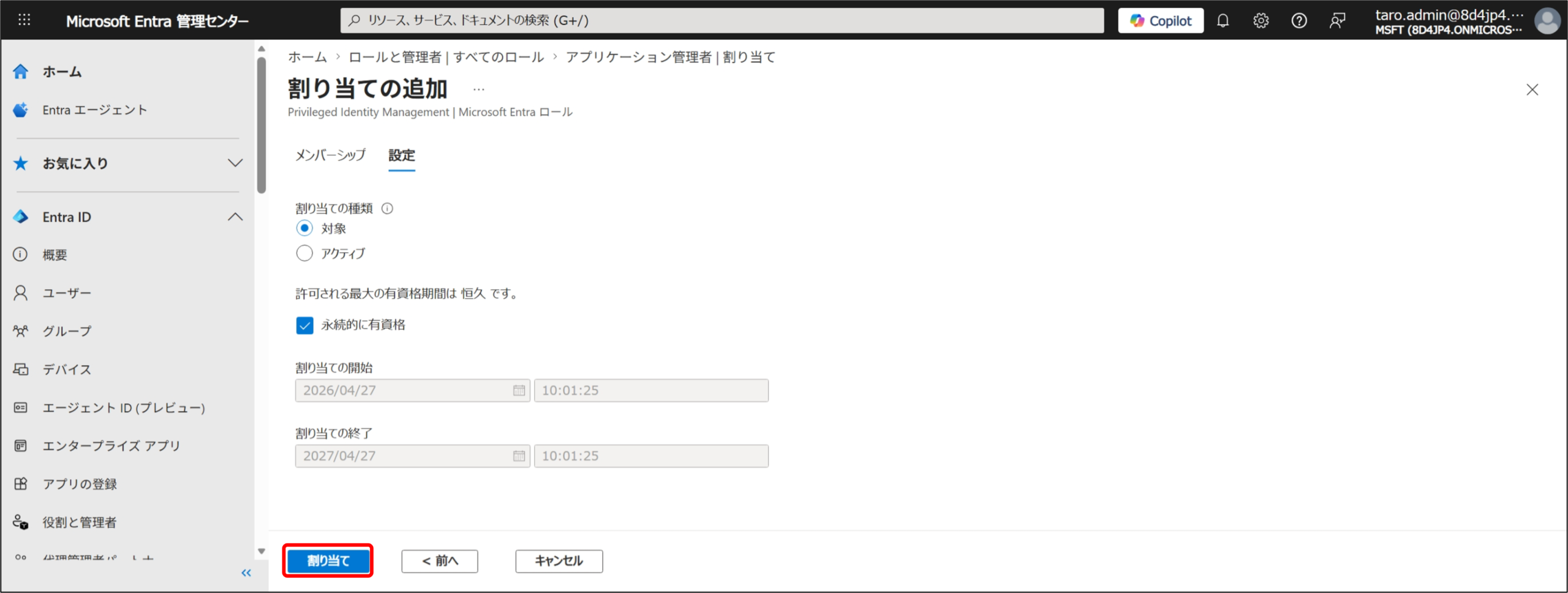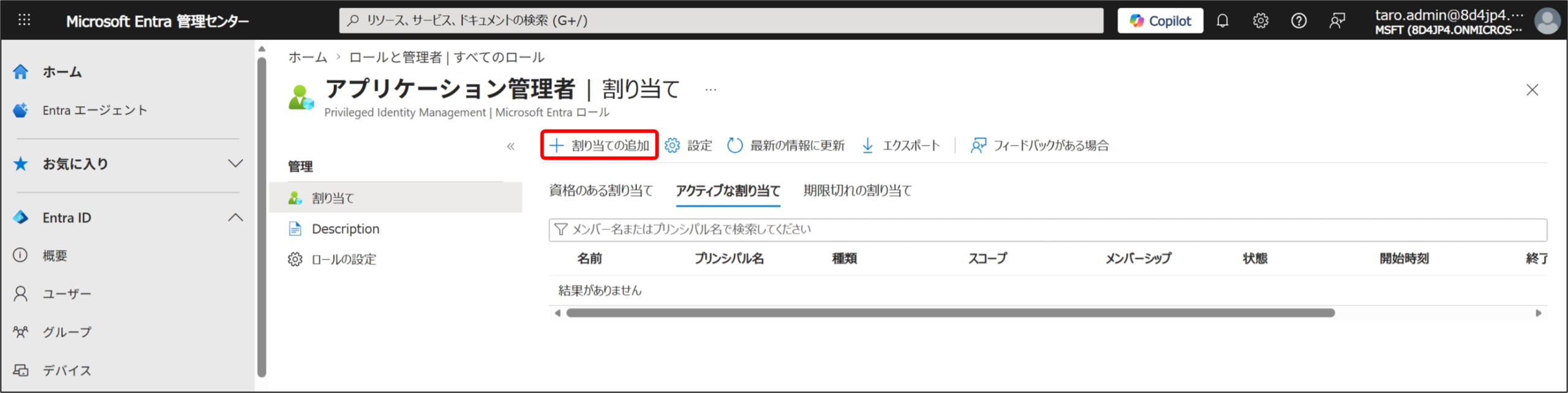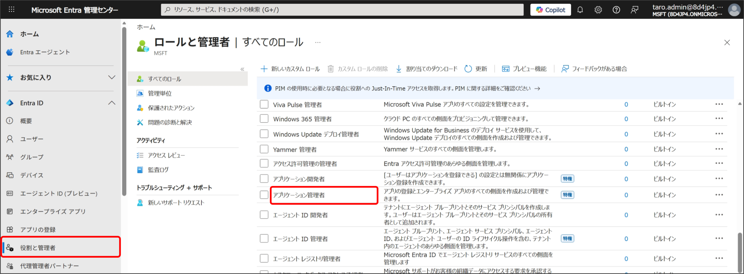 本手順では、Microsoft Entra 管理センターを使用して、必要な管理者ロールを対象のサービスアカウントに割り当てます。