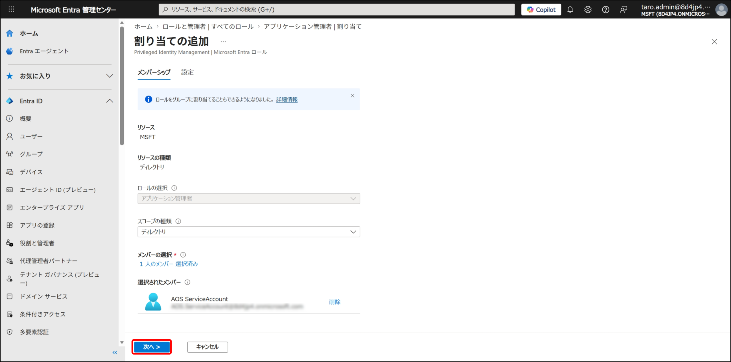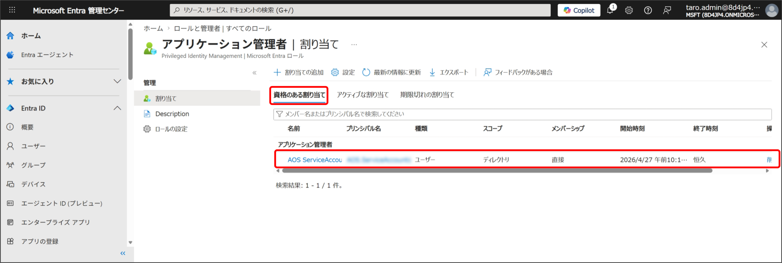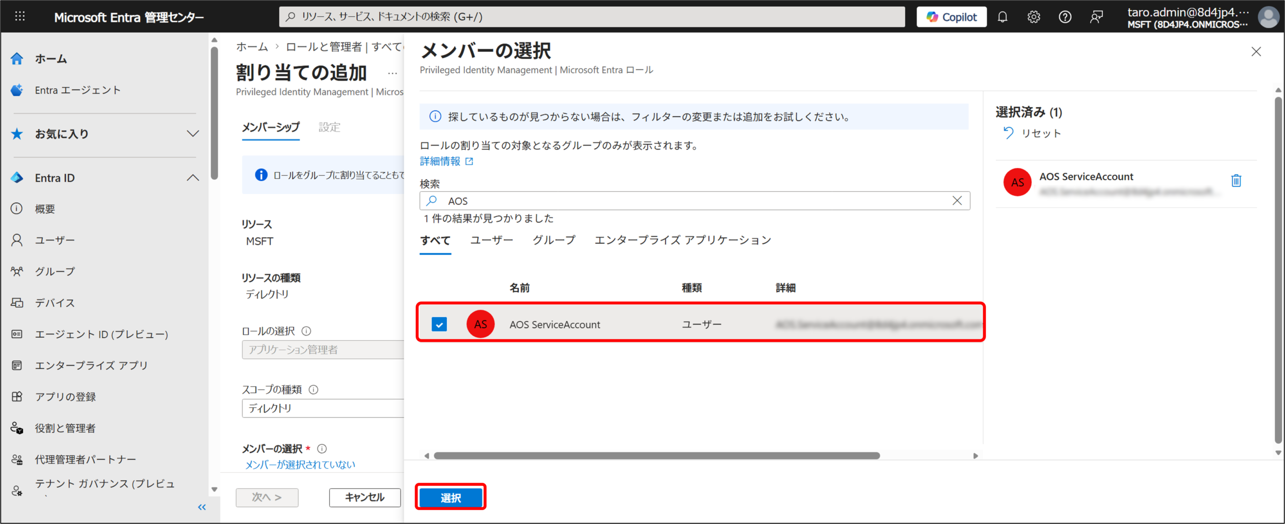AOS で利用するサービスアカウントに対して、Microsoft Entra ID 上の管理者ロールを付与します。