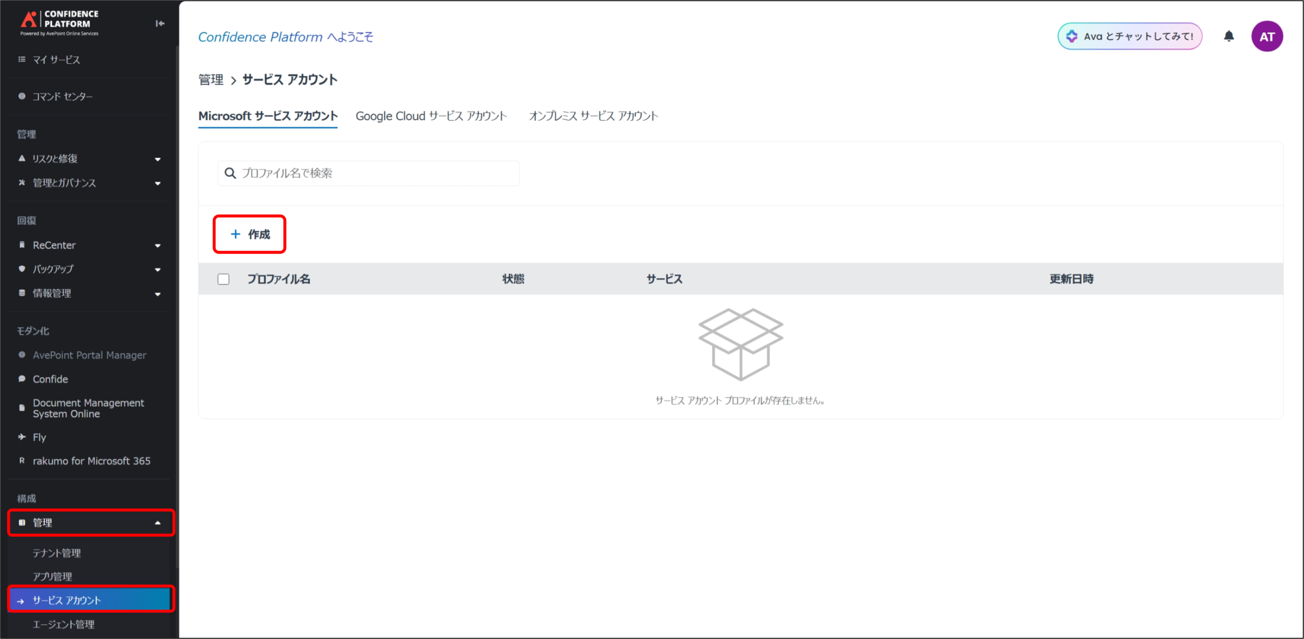 本手順では、対象となる Microsoft 365 テナントを選択し、サービスアカウントの資格情報を登録してプロファイルを作成します。