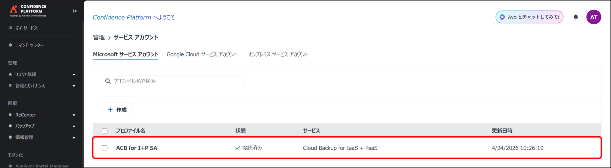 4. サービスアカウント管理 画面に戻り、作成したサービスアカウントプロファイルが一覧に表示されます。
