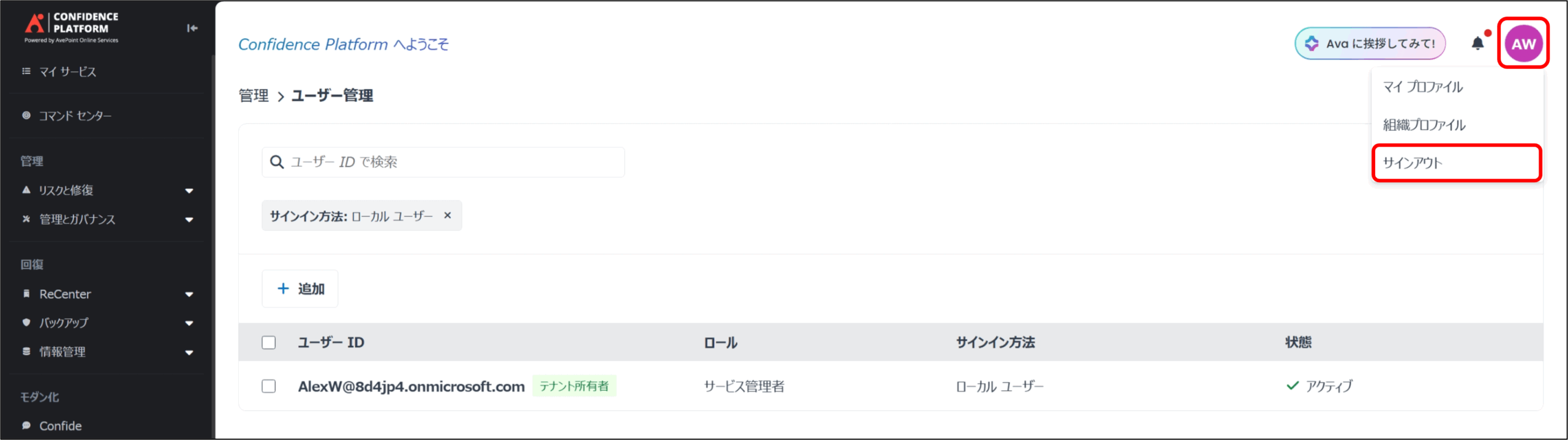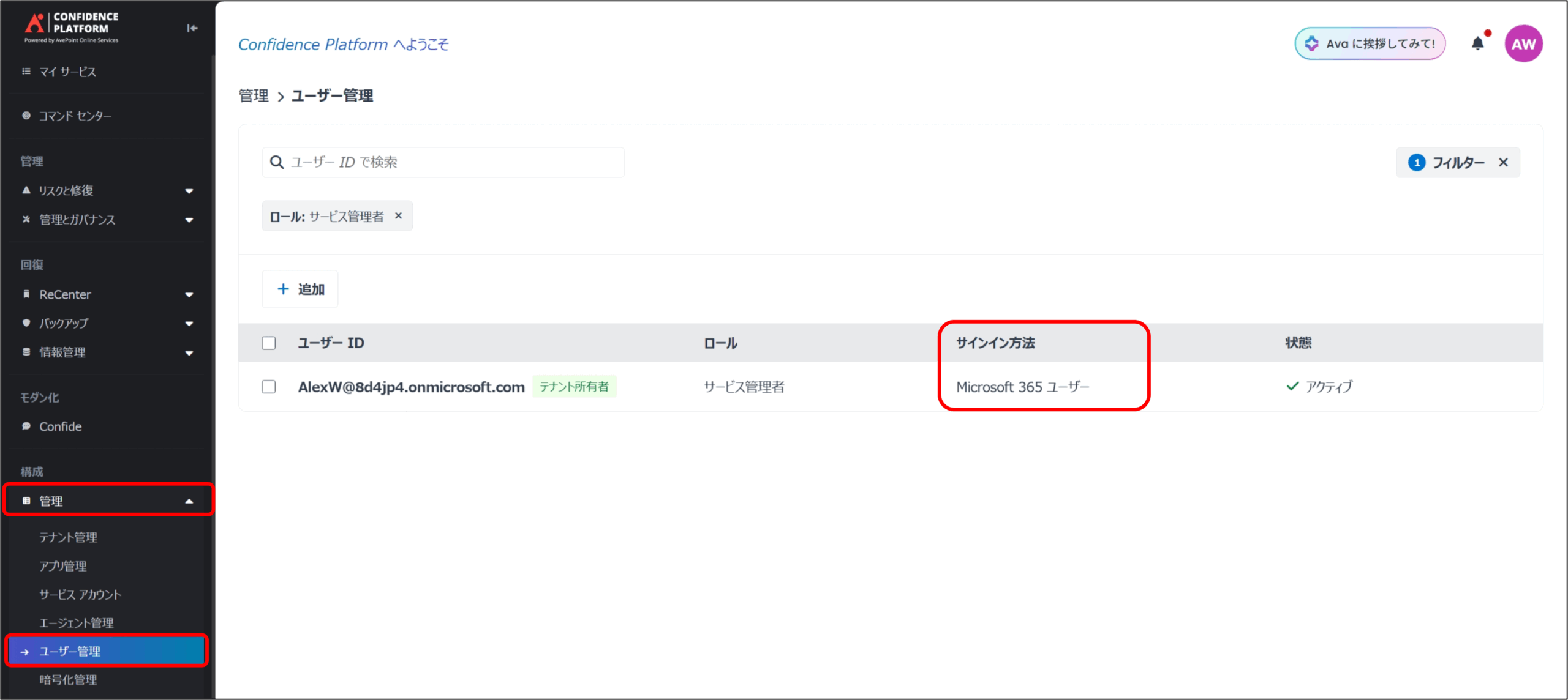 ここまで使用した AOSサインアップ用のアカウント は、ローカルユーザー(サインイン方法がAvePoint 設定のIDとPWを利用) としてAOSにユーザー登録されています。