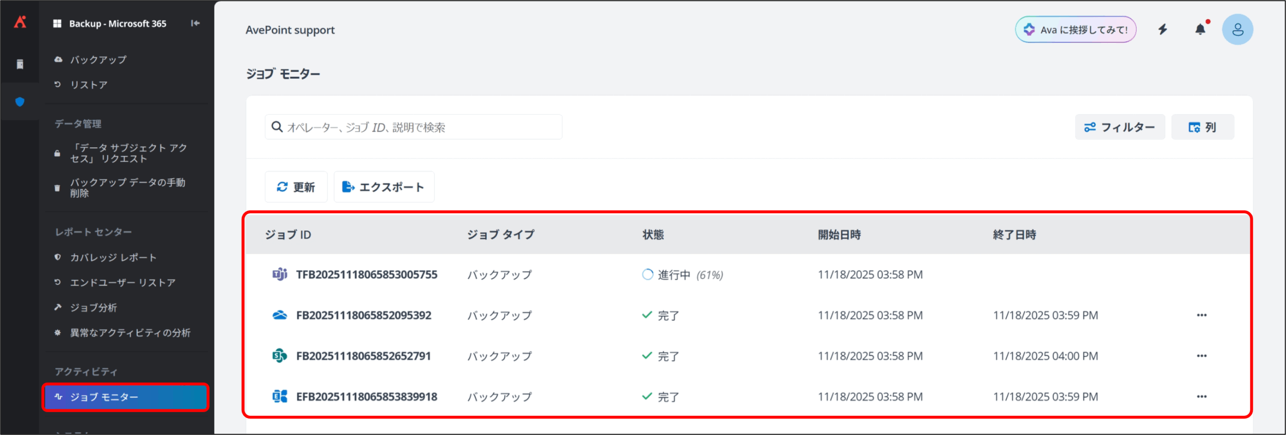 ジョブの実行状況は、ジョブモニター 画面より確認可能です。