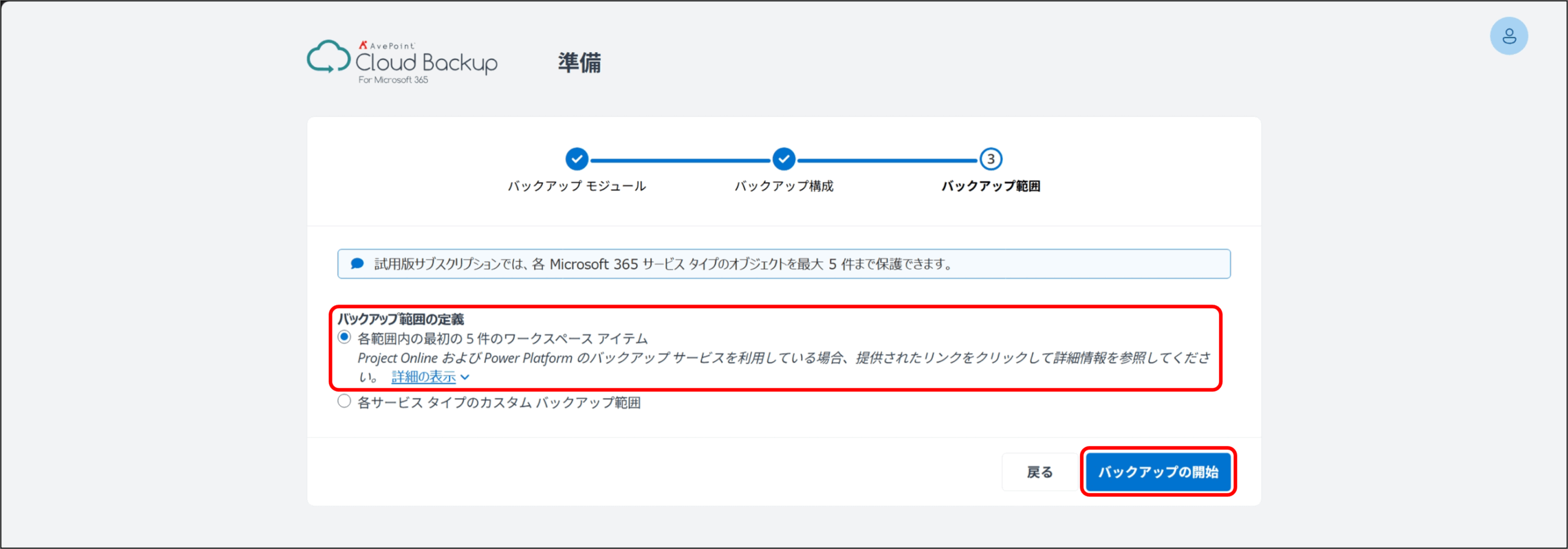 6.バックアップ 画面が表示されるので、[各範囲内の最初の5件のワークスペース アイテム] 選択して [バックアップの開始] をクリックします。