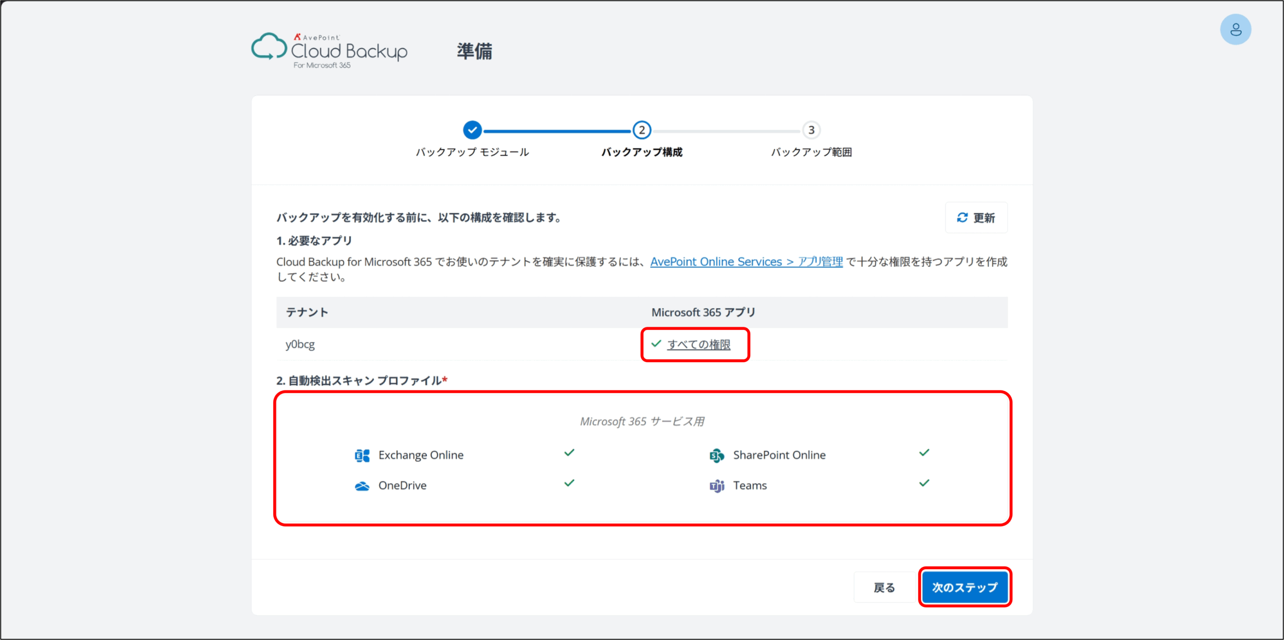 4.バックアップ構成 画面が表示されるので、各項目にチェックが表示されていることを確認して [次のステップ] をクリックします。