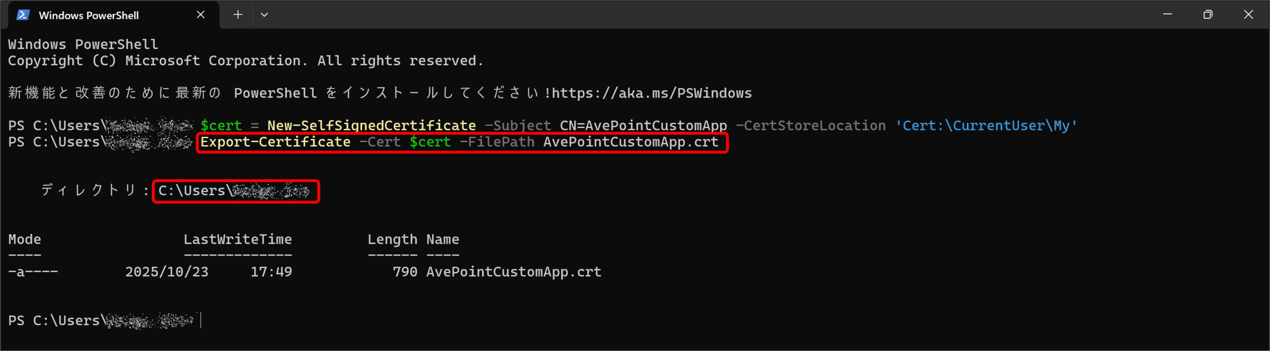 Export-Certificate -Cert $cert -FilePath AvePointCustomApp.crt もしくは