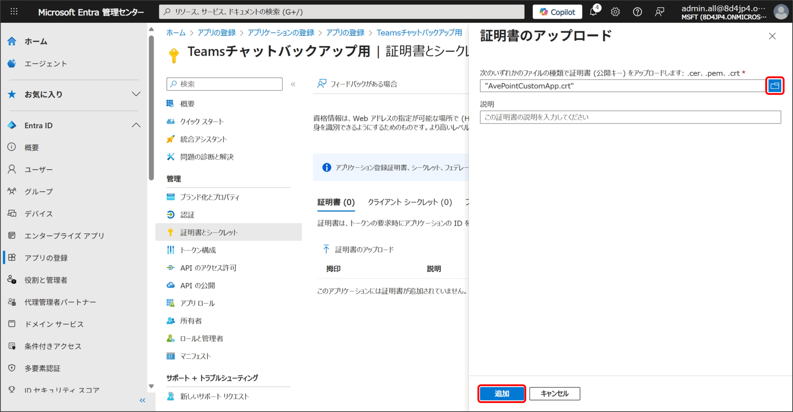 10.証明書のアップロード 画面が表示されるので、ファイルのアイコンをクリックし、作成した 証明書 (拡張子 .crt もしくは .cer) をアップロードして [追加] をクリックします。