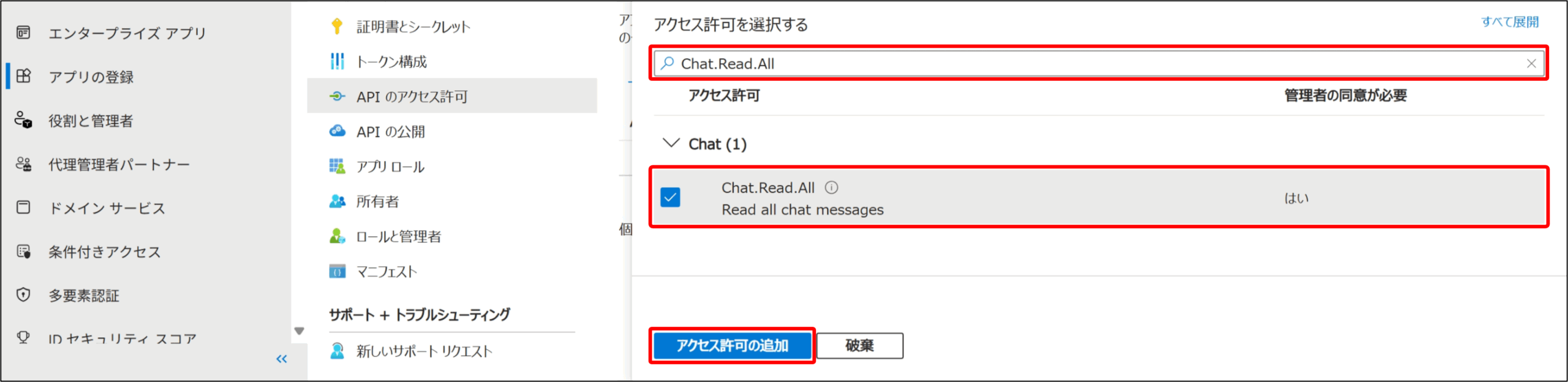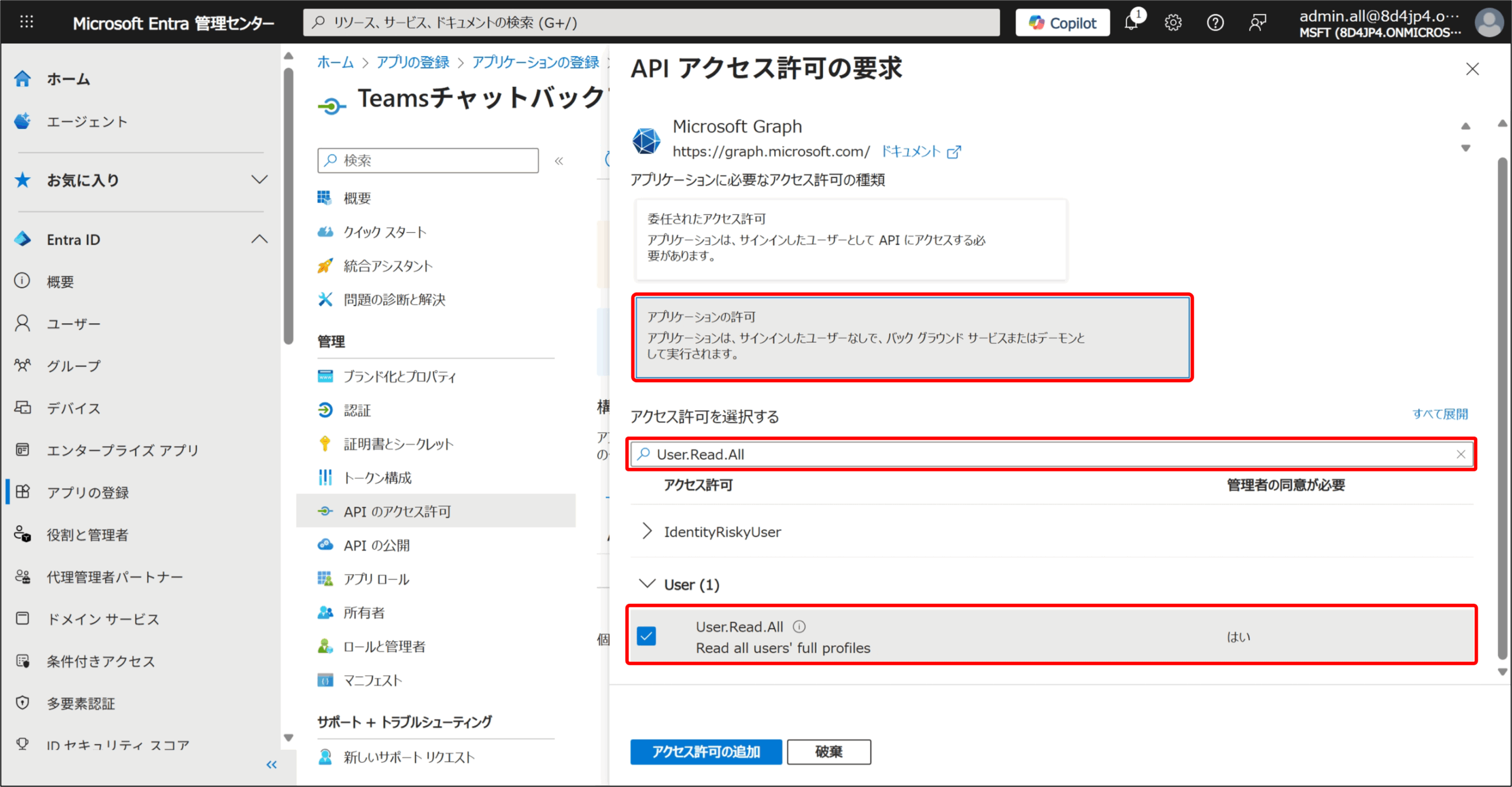 6.[アプリケーションの許可] をクリックし、検索欄に下記の値を入力して検索して、検索結果にチェックを入れて、[アクセス許可の追加] をクリックします。