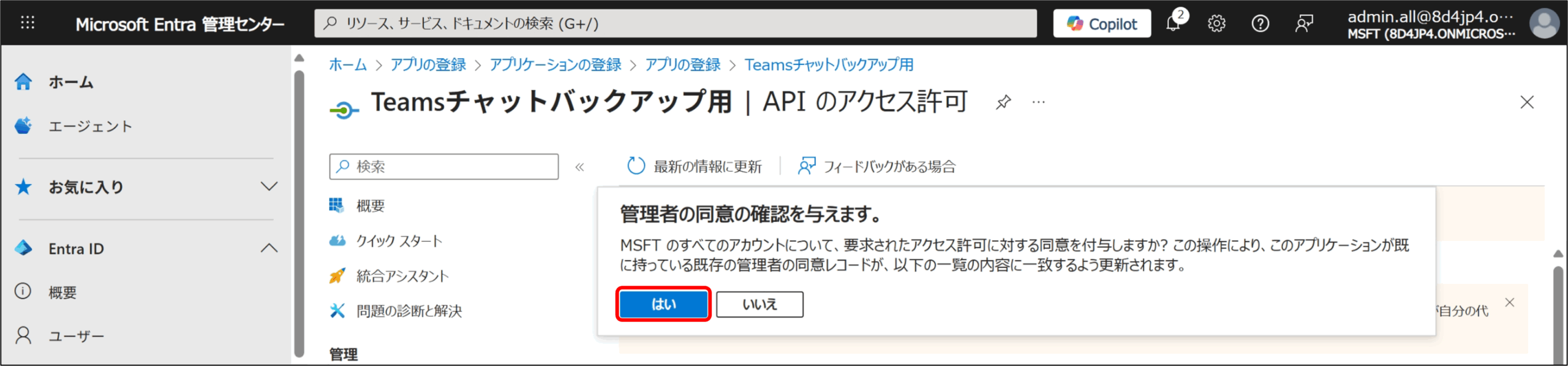 8.管理者の同意の確認を与えます。ポップアップが表示されるので、内容を確認して問題なければ [はい] をクリックします。