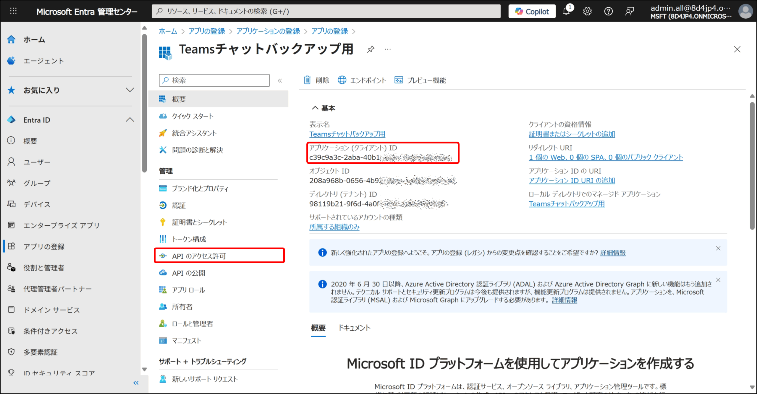 ※ [アプリケーション (クライアント) ID] は、この後の手順である カスタムアプリプロファイルの作成 に必要になります。