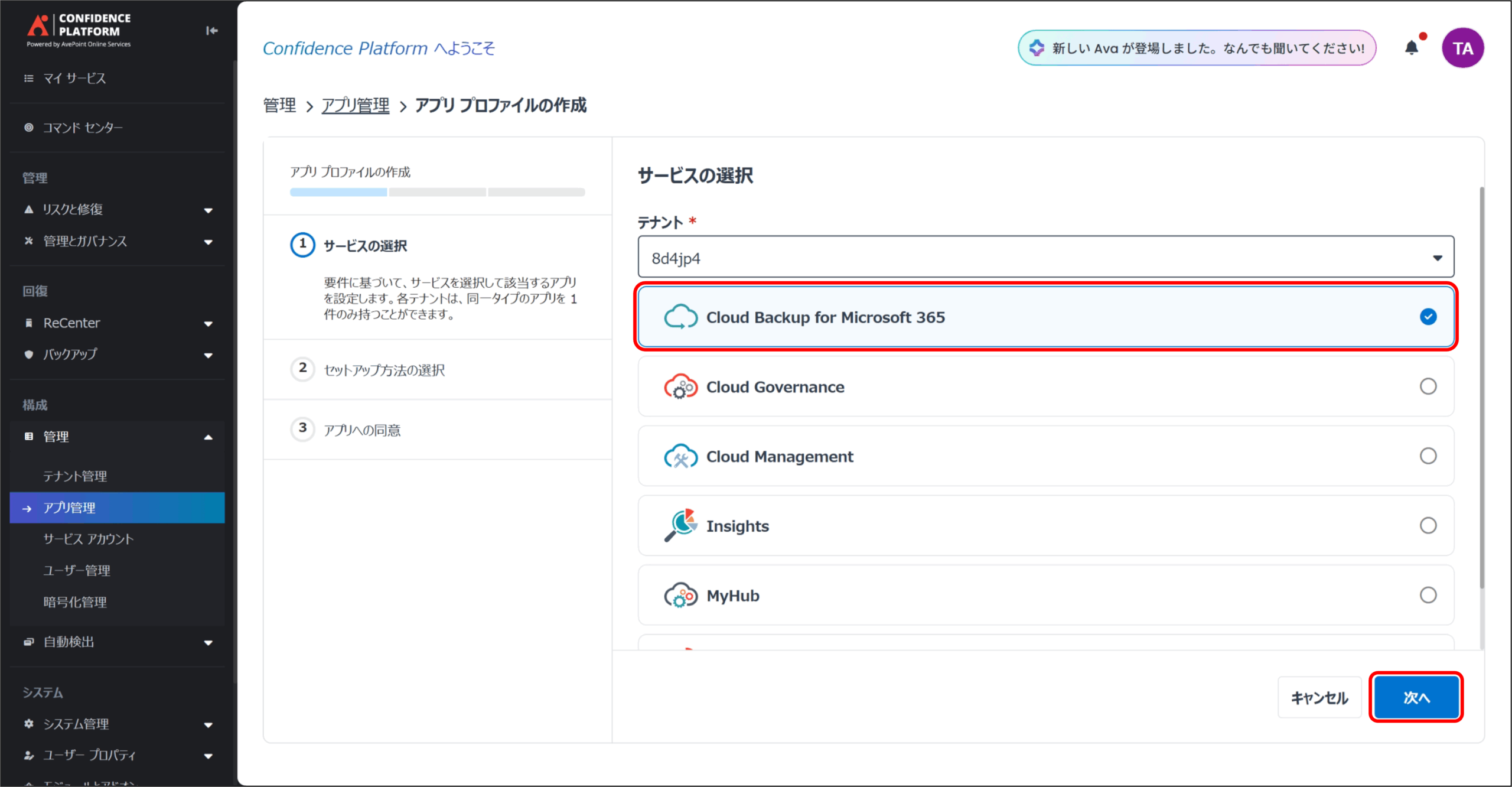 3.アプリプロファイルの作成 画面が表示されるので、テナントリストから登録済みテナントを選択し、[Cloud Backup for Microsoft 365] にチェックをいれて、[次へ] をクリックします。