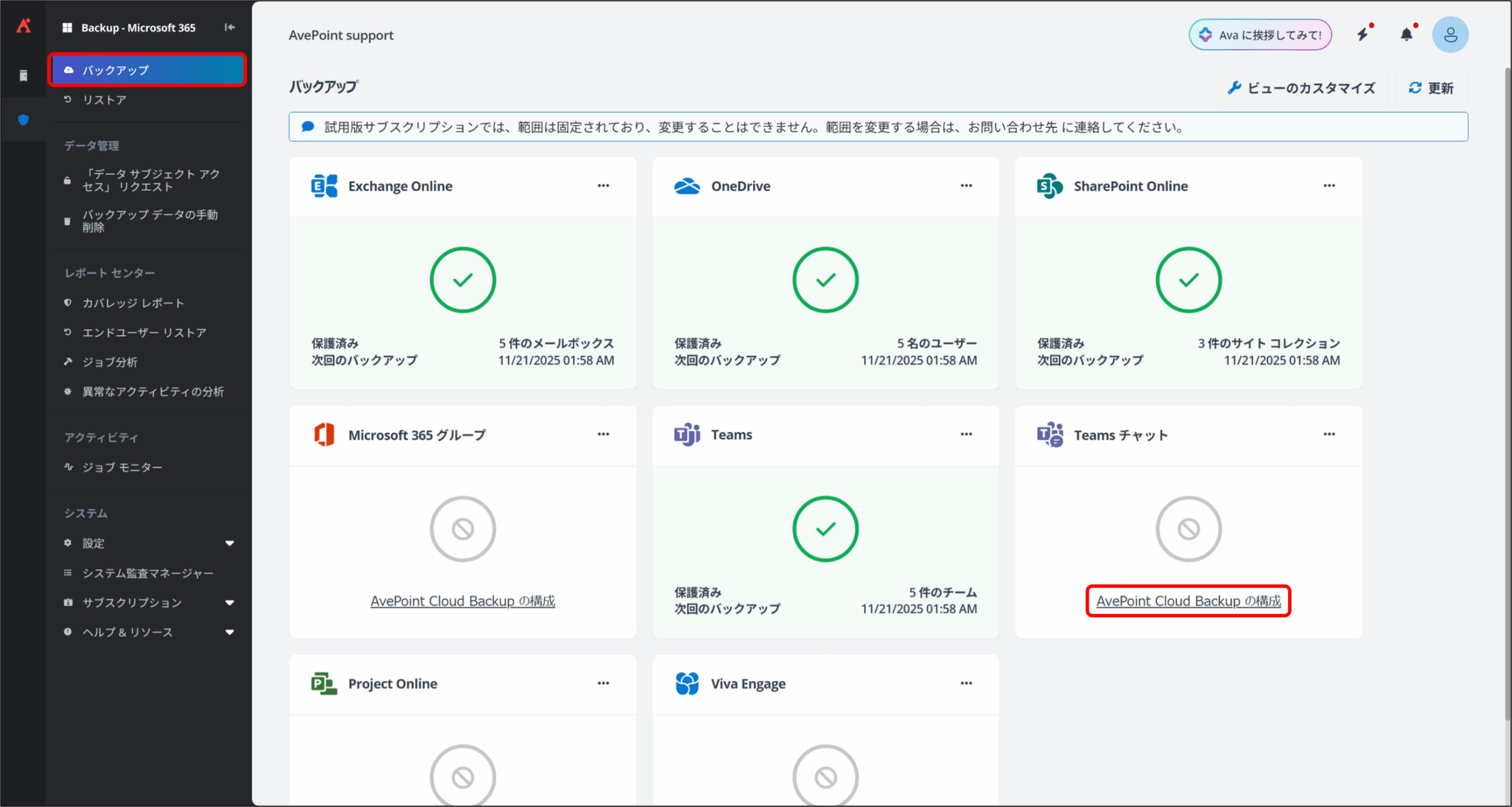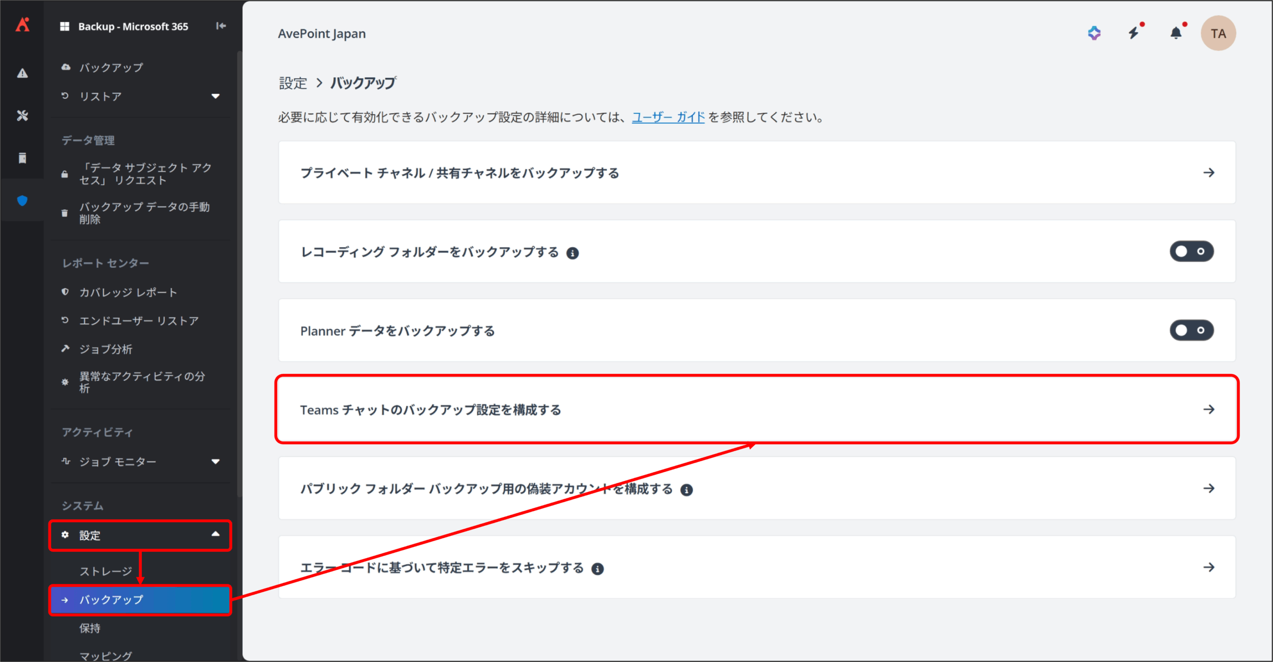 1.[バックアップ] をクリックし、バックアップ 一覧画面が表示されるので、[Teams チャット] の [AvePoint Cloud Backup の構成] をクリックします。