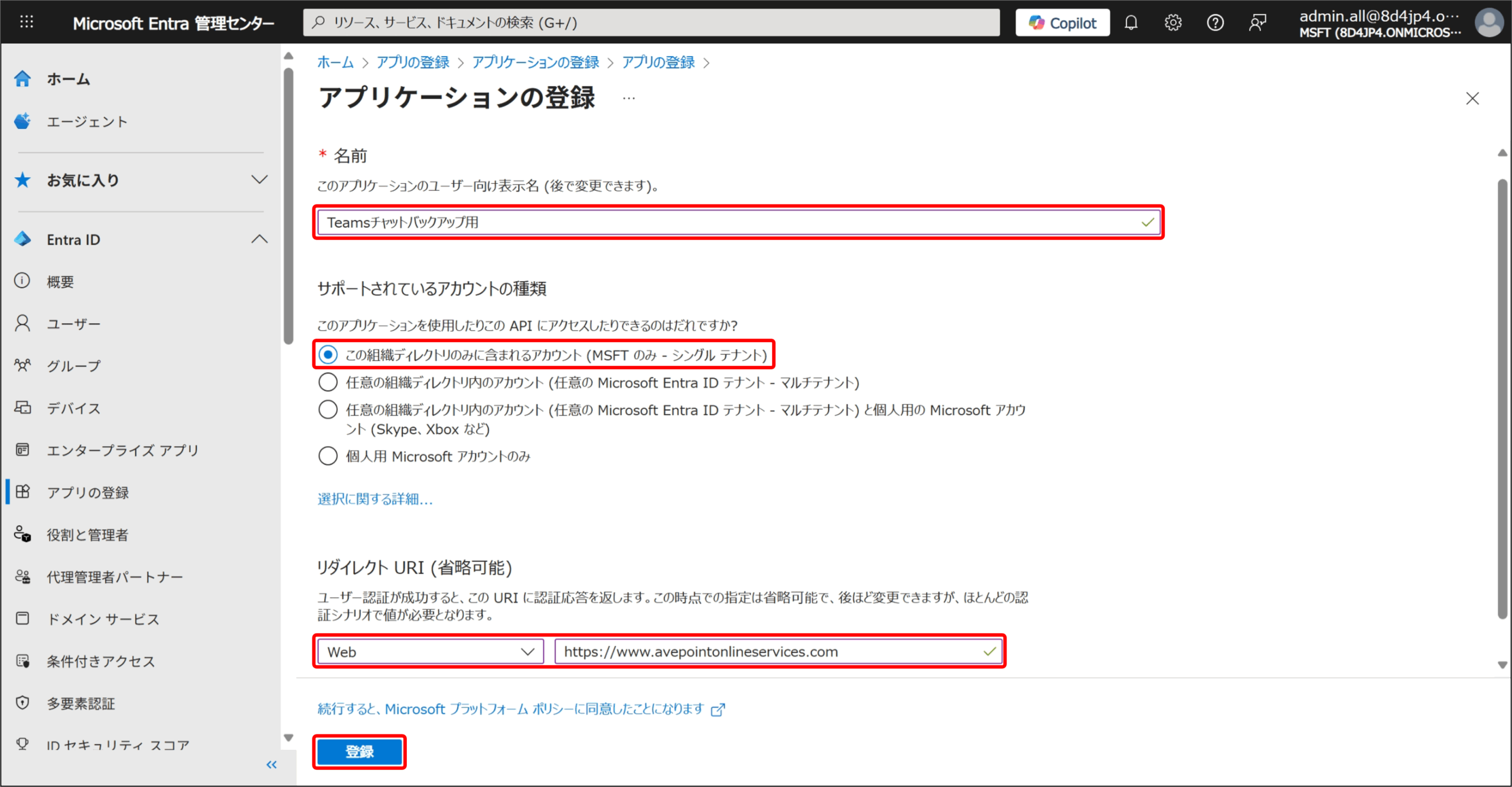 Entra ID上に、Teams チャットバックアップを実行するアプリを作成します。こちらで作成したアプリを、次の手順でAOSに登録します。