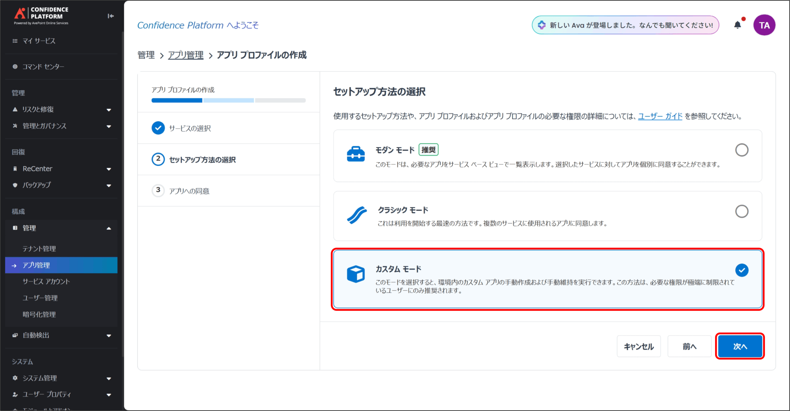 4.セットアップ方法の選択 画面が表示されるので、[カスタム モード] を選択し、[次へ] をクリックします。