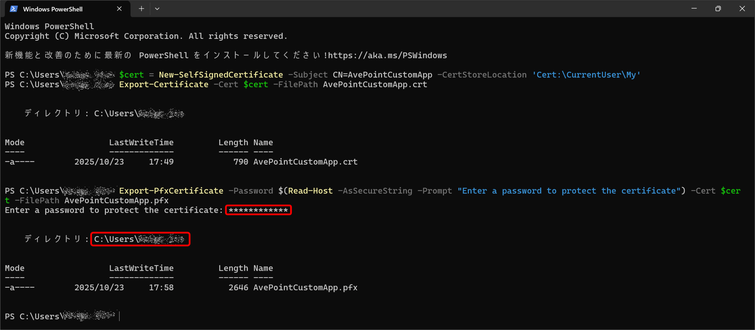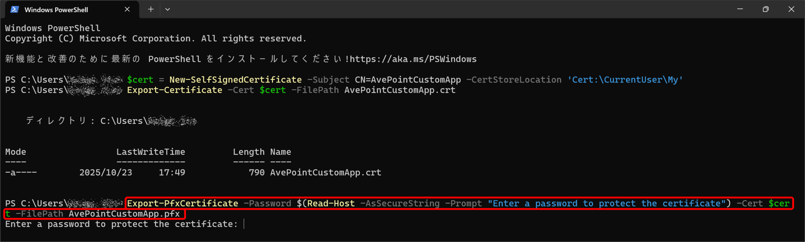 Export-PfxCertificate -Password $(Read-Host -AsSecureString -Prompt “Enter a password to protect the certificate”) -Cert $cert -FilePath AvePointCustomApp.pfx