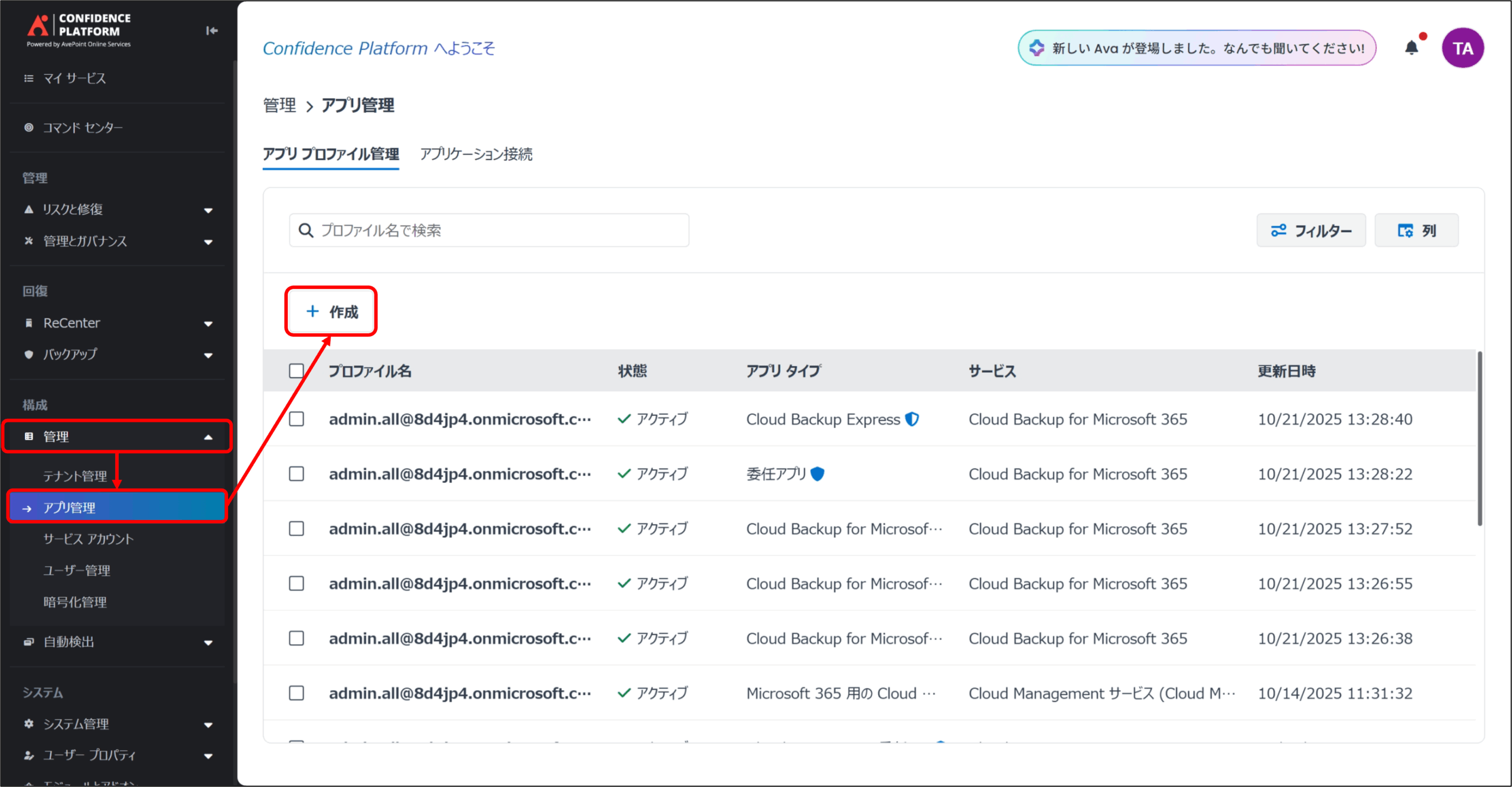 2.[管理] から [アプリ管理] を表示し、[+ 作成] をクリックします。
