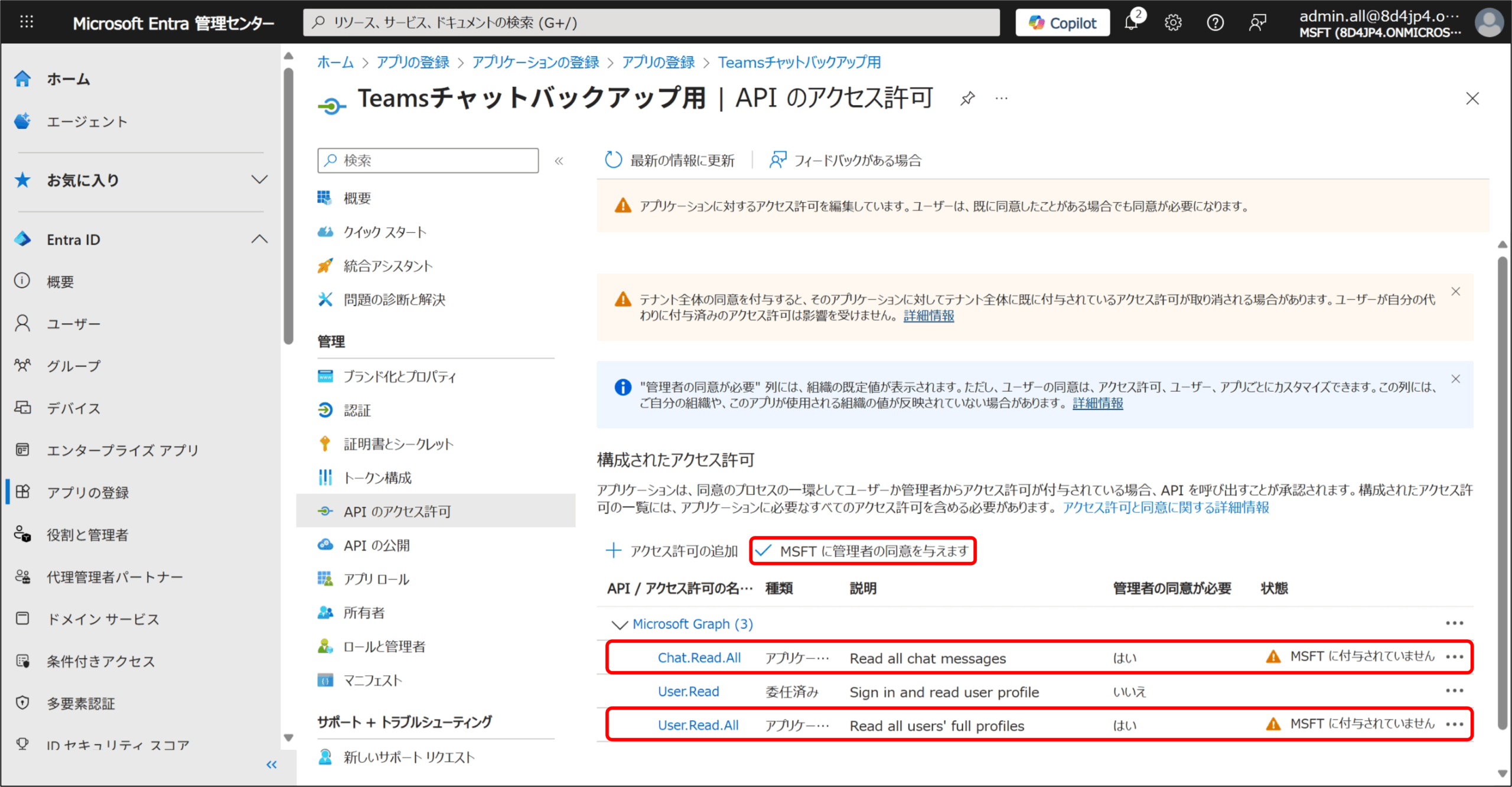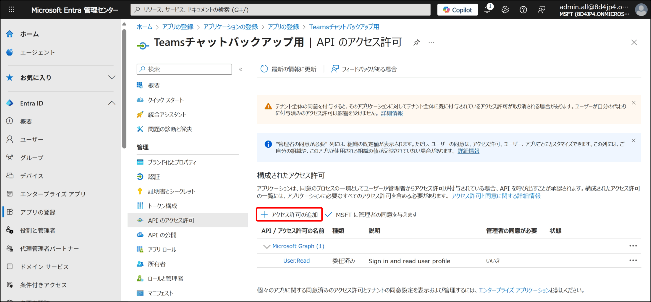 7.API のアクセス許可 画面に戻るので、選択したアクセス許可が追加されていることを確認し、[テナント名 に管理者の同意を与えます] をクリックします。