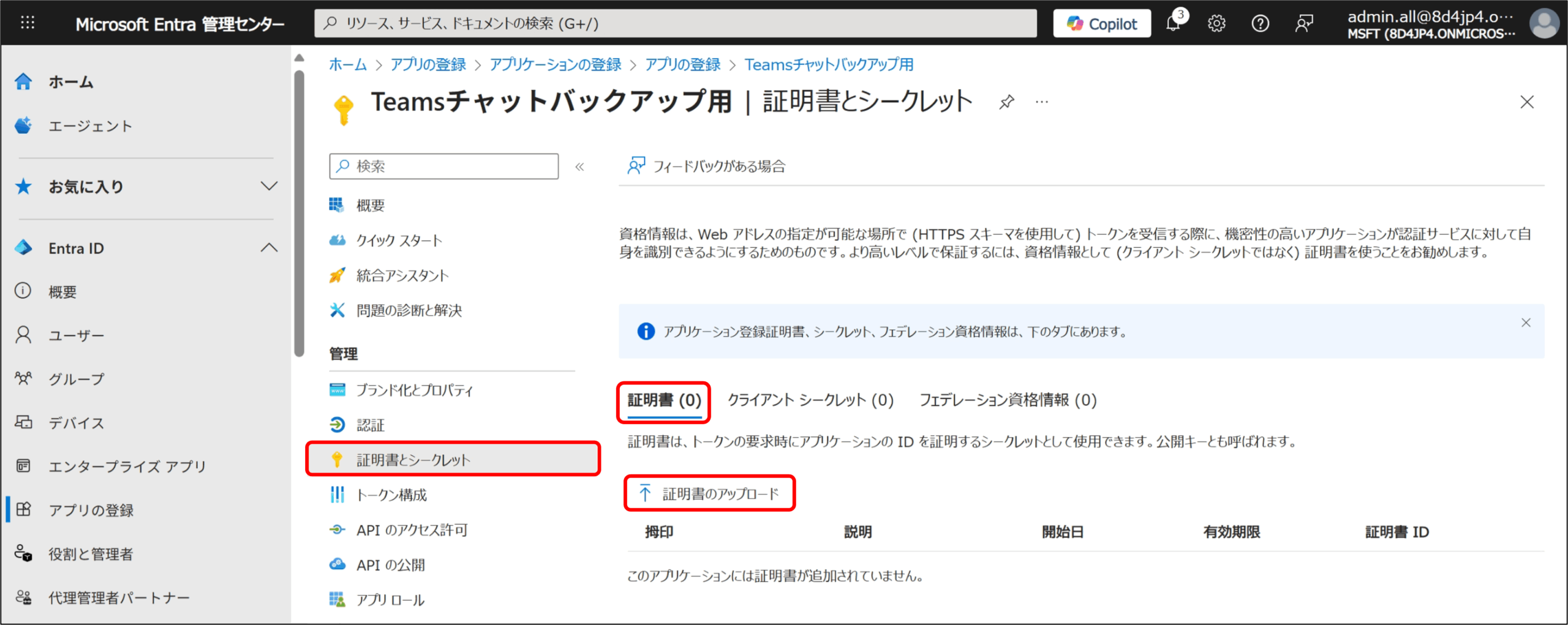 以上でTeamsチャット バックアップ用の証明書作成が完了になります。