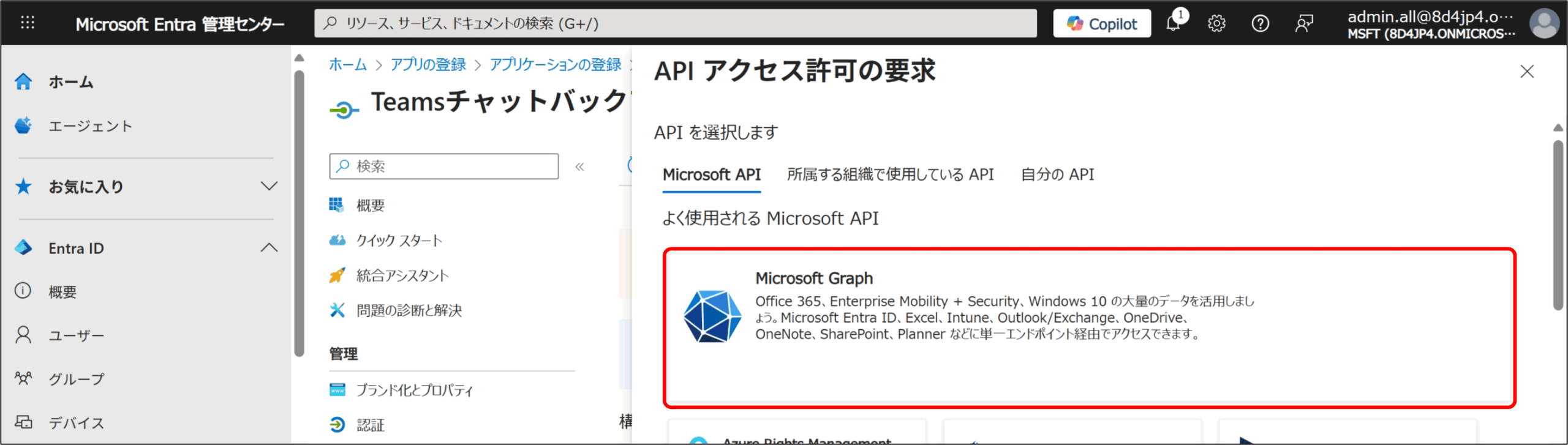 5.API アクセス許可の要求 画面が表示されるので、[Microsoft Graph] をクリックします。
