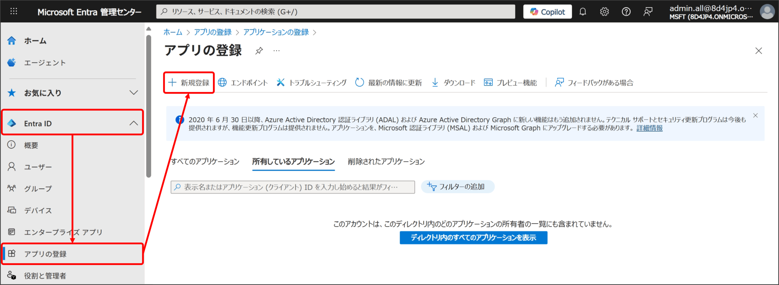 1.アプリ登録用のM365アカウント (グローバル管理者権限) で Microsoft Entra 管理センター にアクセスし、[Entra ID] > [アプリの登録] の順に移動して、[+ 新規登録] をクリックします。