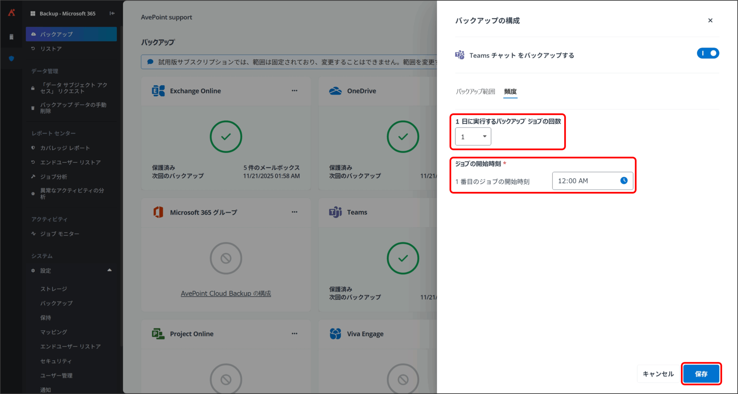 Teams チャットバックアップを取りたいユーザーと、ジョブ実行時刻を設定します。
