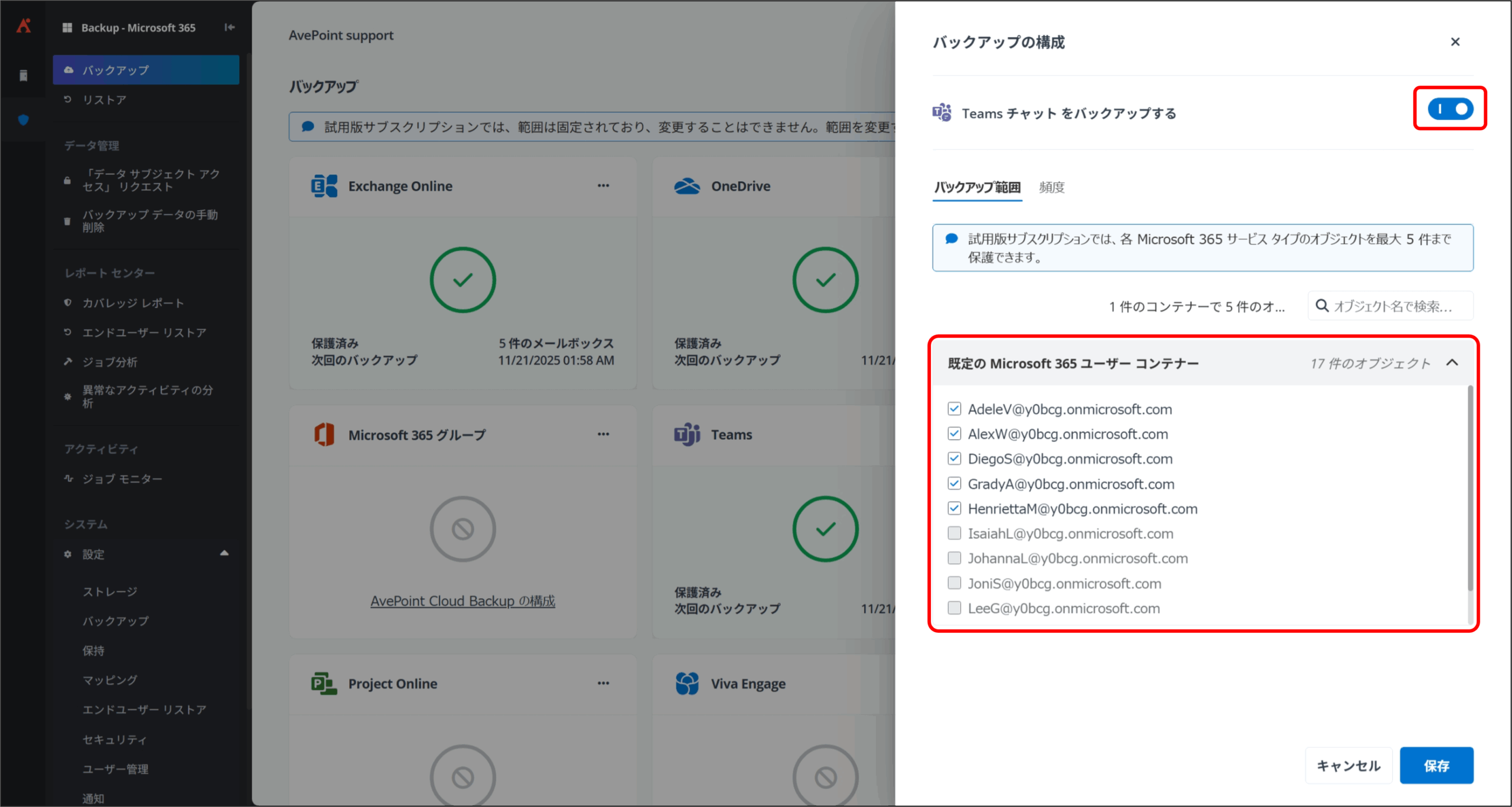 2.バックアップの構成 画面が表示されるので、[Teams チャット をバックアップする] のトグルをオンにし、バックアップ対象となるコンテナーにチェックを入れます。