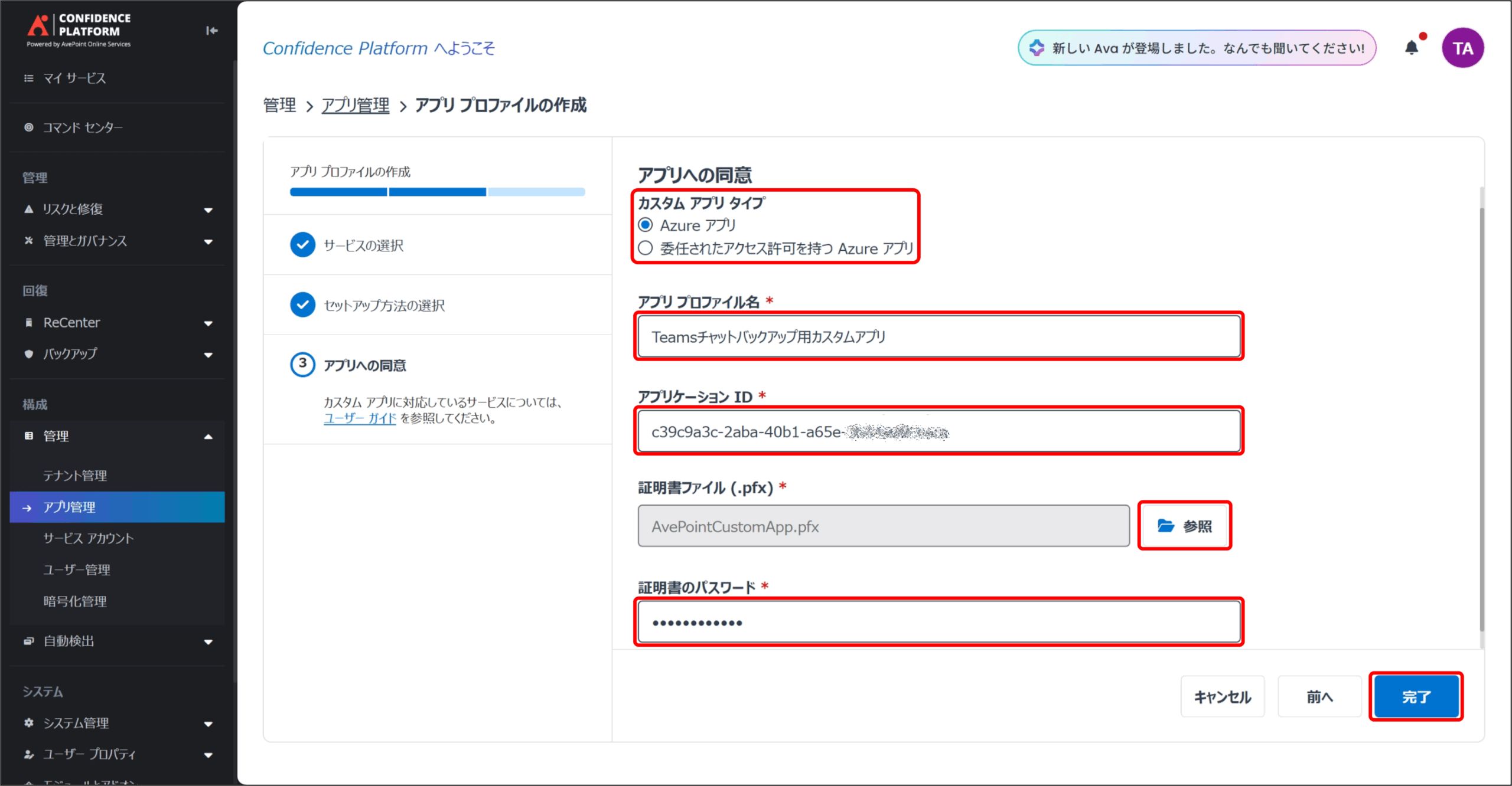 以上でTeamsチャット バックアップ用のカスタムアプリ登録が完了になります。