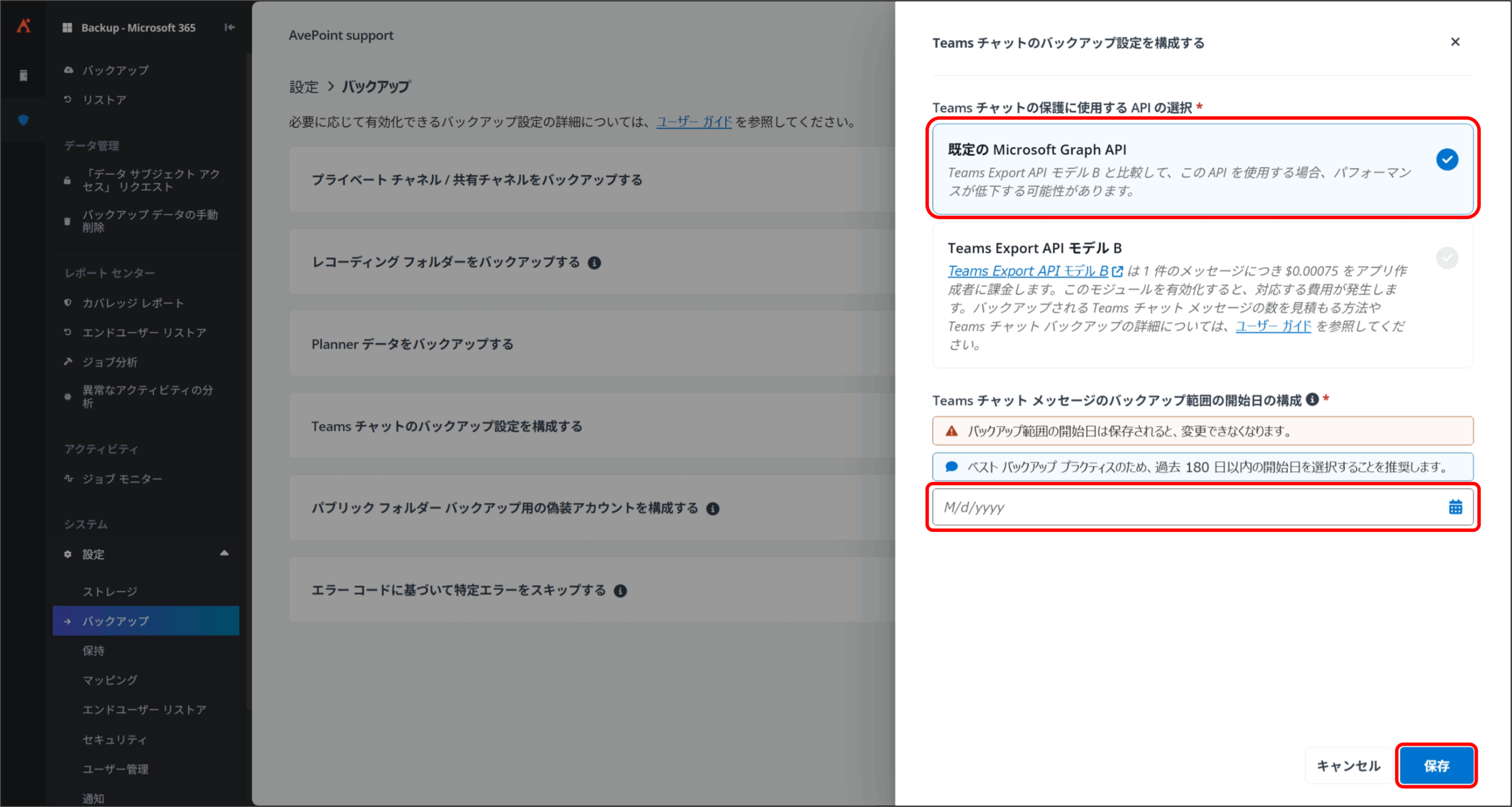 4.Teams チャットのバックアップ設定 画面が表示されるので、[Teams チャットの保護に使用する API の選択] で [既定の Microsoft Graph API] を選択し、[Teams チャット メッセージのバックアップ範囲の開始日の構成] でバックアップ範囲の開始日を選択します。