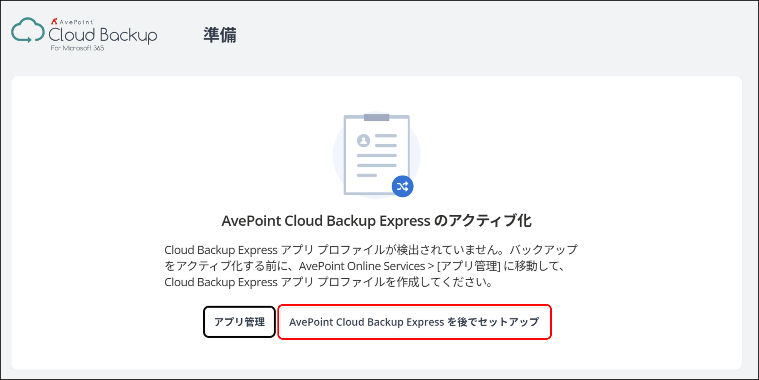 3.AvePoint Cloud Backup Express のアクティブ化 画面が表示されるので、[AvePoint Cloud Backup Express を後でセットアップ] をクリックします。