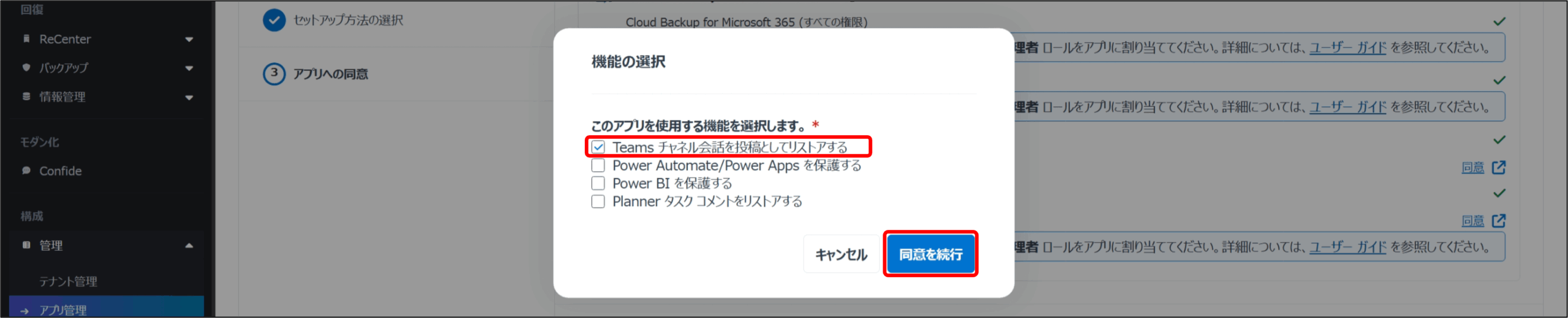 ※ 機能の選択 画面が表示されるので、[Teams チャネル会話を投稿としてリストアする] を選択します。