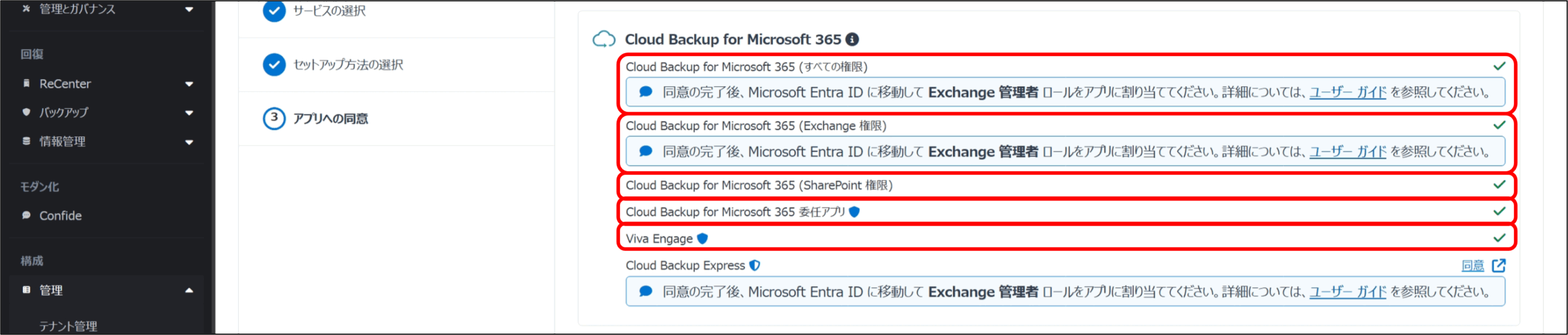 本手順で必要なアプリプロファイルは以下になります。- Cloud Backup for Microsoft 365 (すべての権限)