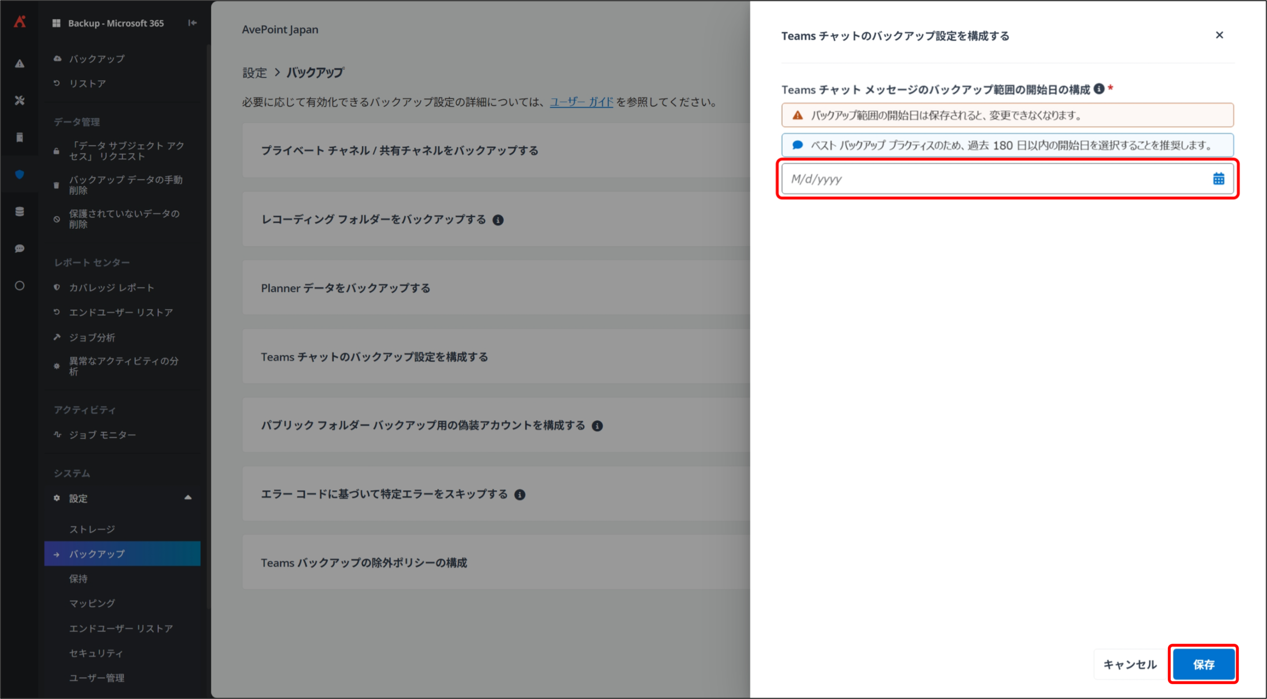 4.Teams チャットのバックアップ設定 画面が表示されるので、[Teams チャット メッセージのバックアップ範囲の開始日の構成] でバックアップ範囲の開始日を選択します。