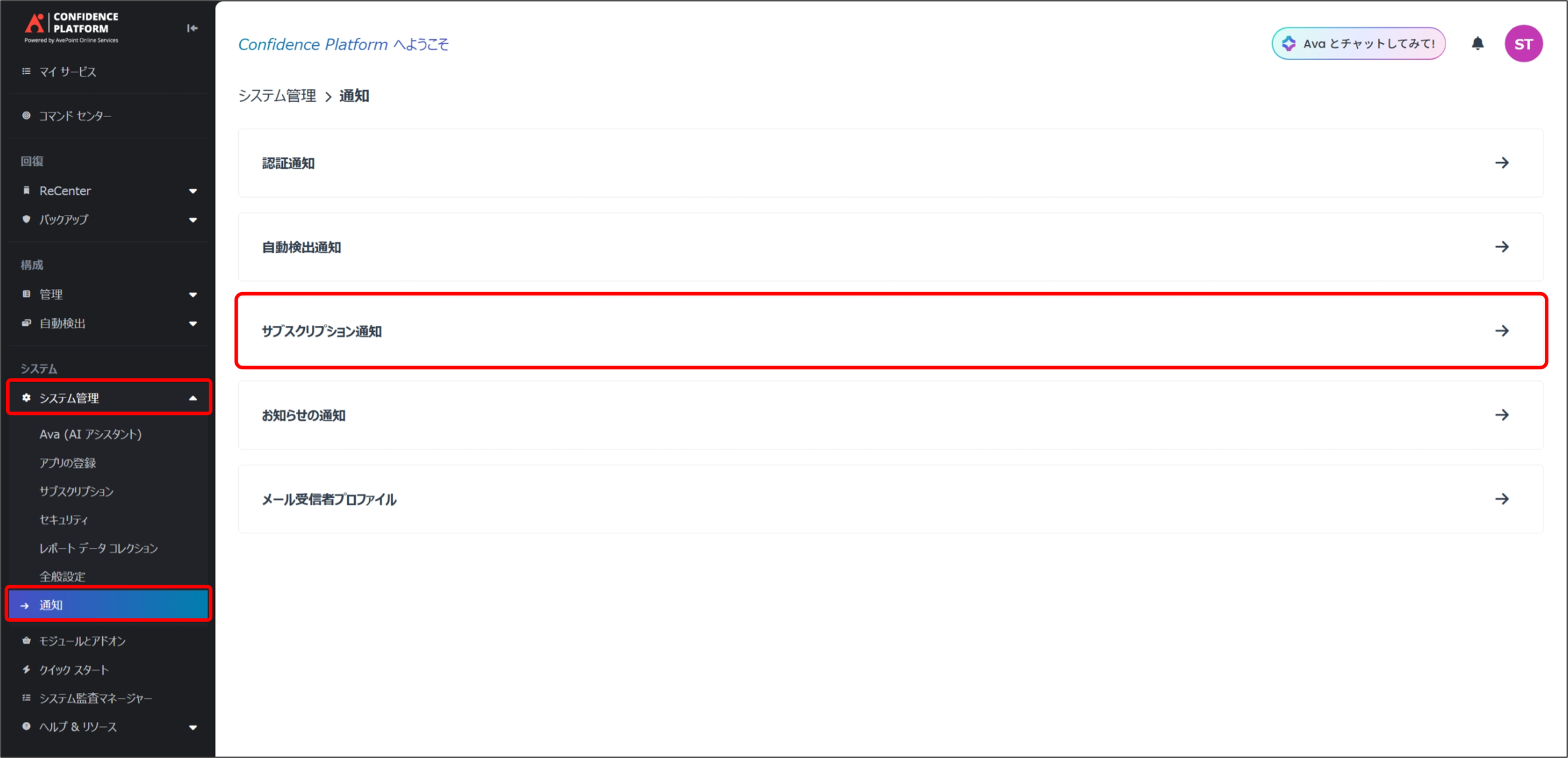 A. 納品先メールの送付先は、AOS > [システム管理] > [通知] > [サブスクリプション通知] から変更可能です。