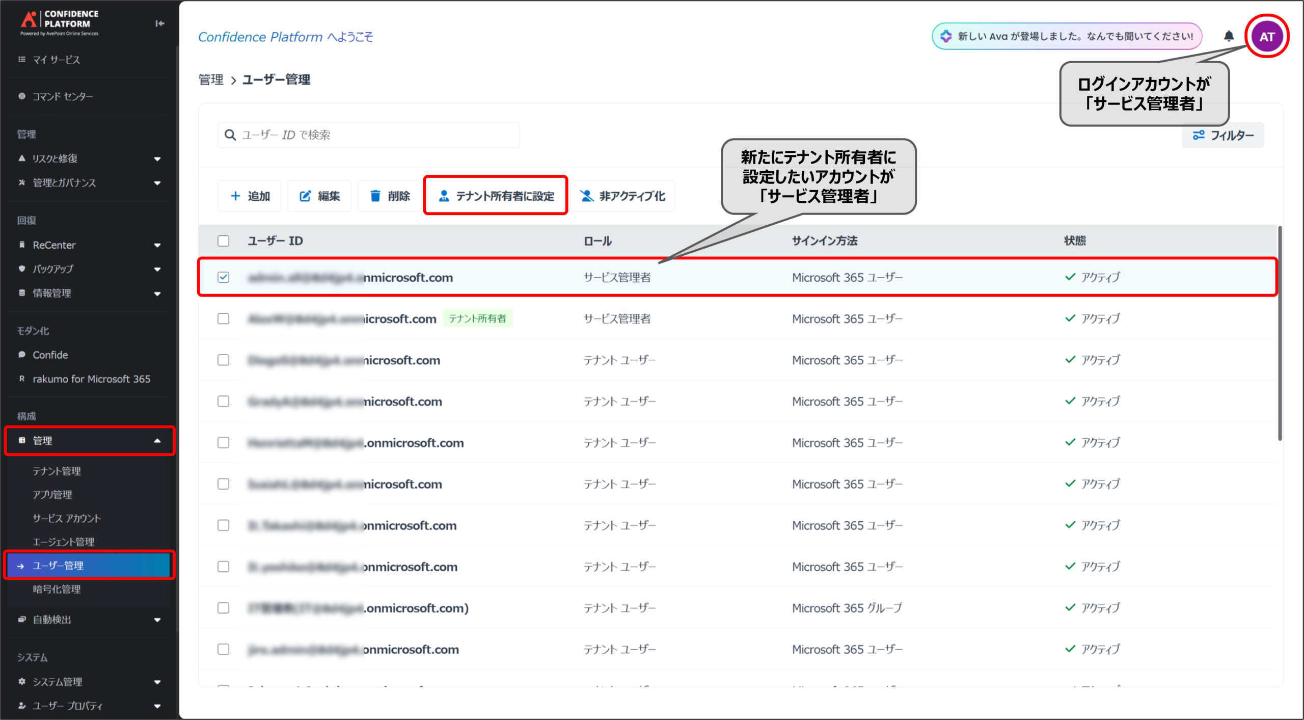 - [管理] > [ユーザーの管理] より、テナント所有者として設定したいユーザーのケースを確認します。