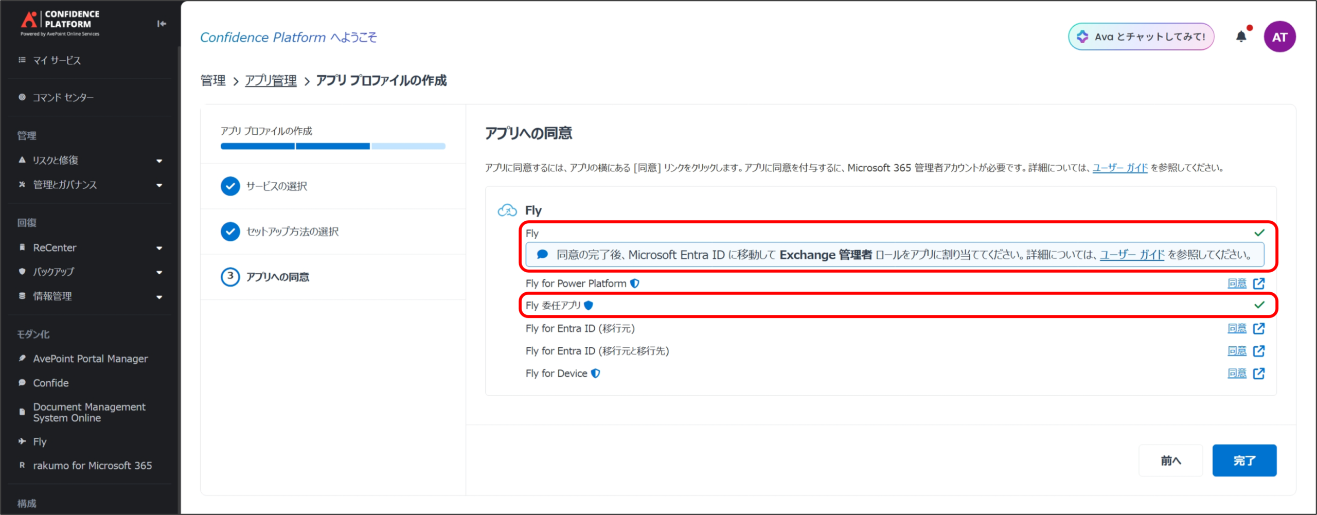 ※ 同意後に、Entra ID にて [AvePoint Fly] に [Exchangeの管理者] ロールを割り当てます。 - FLY 委任アプリ
