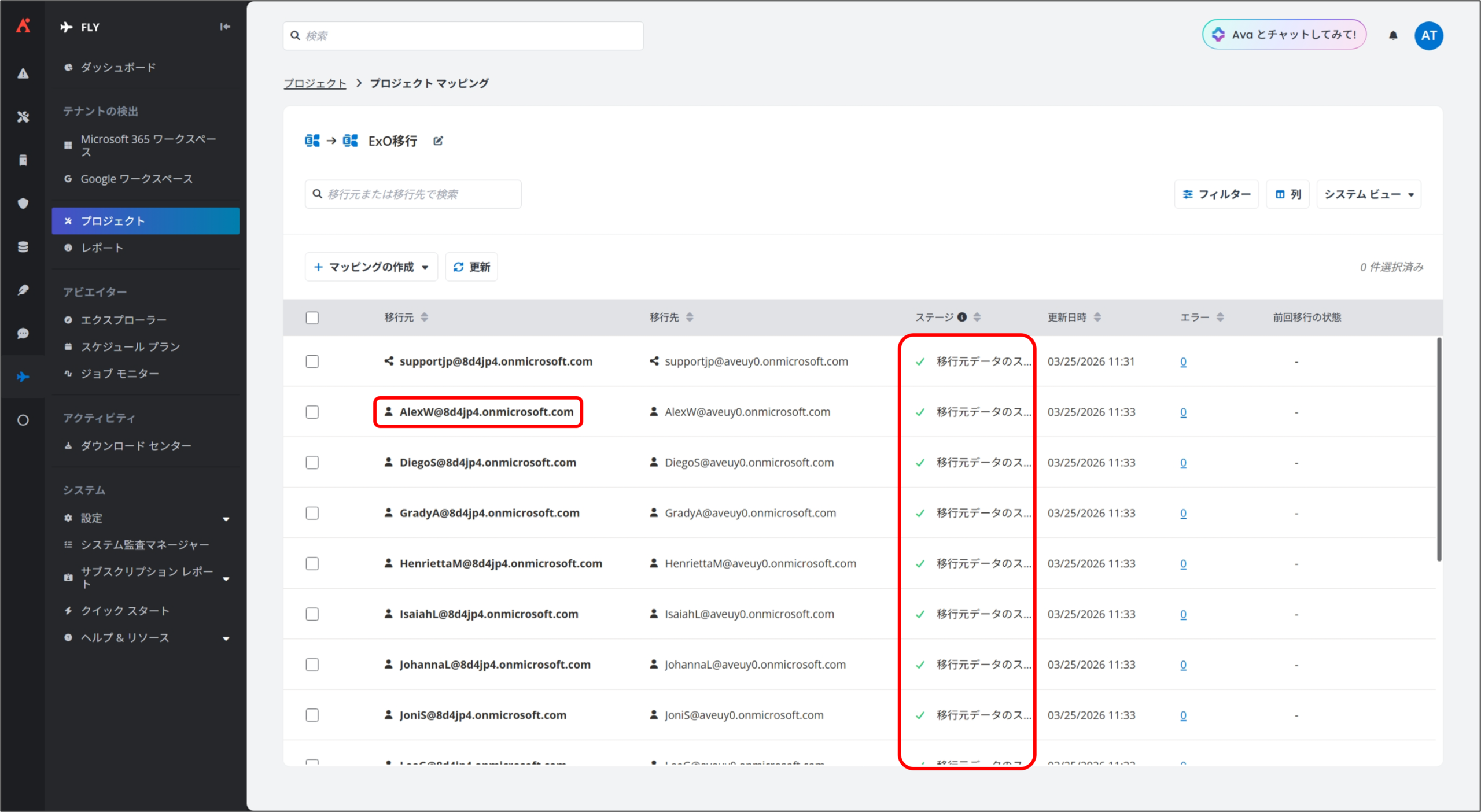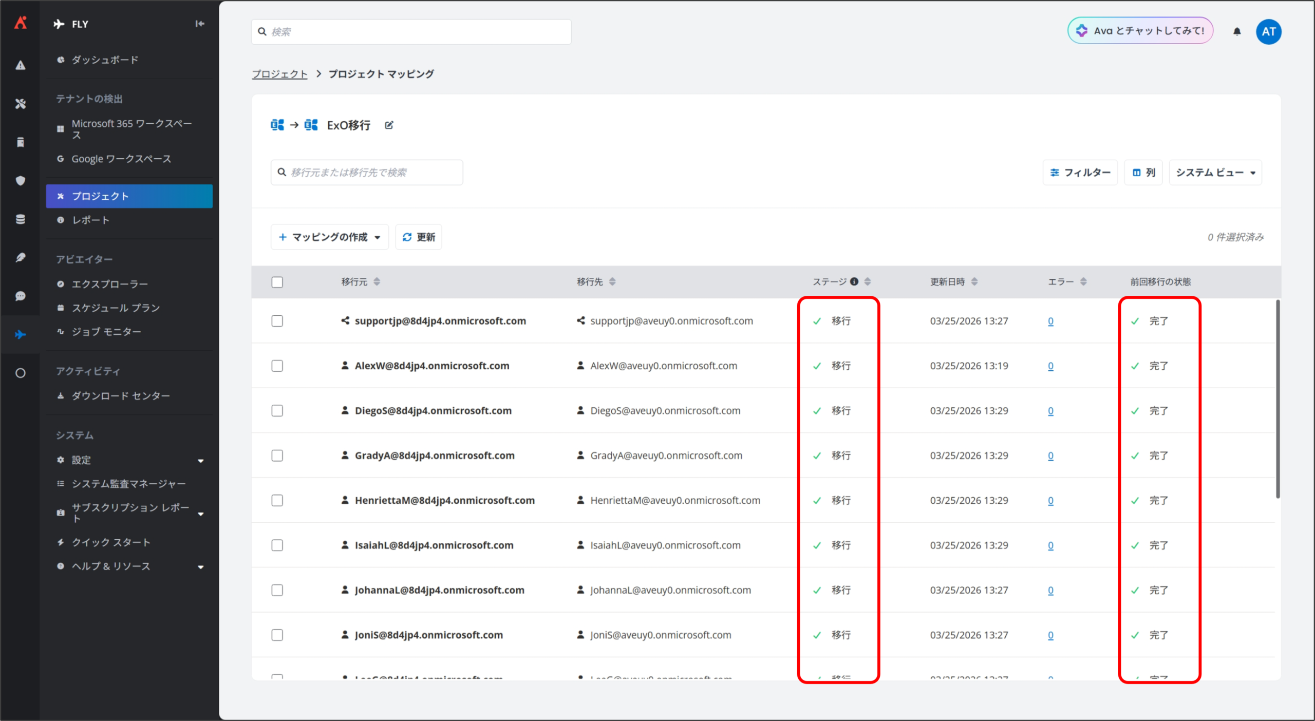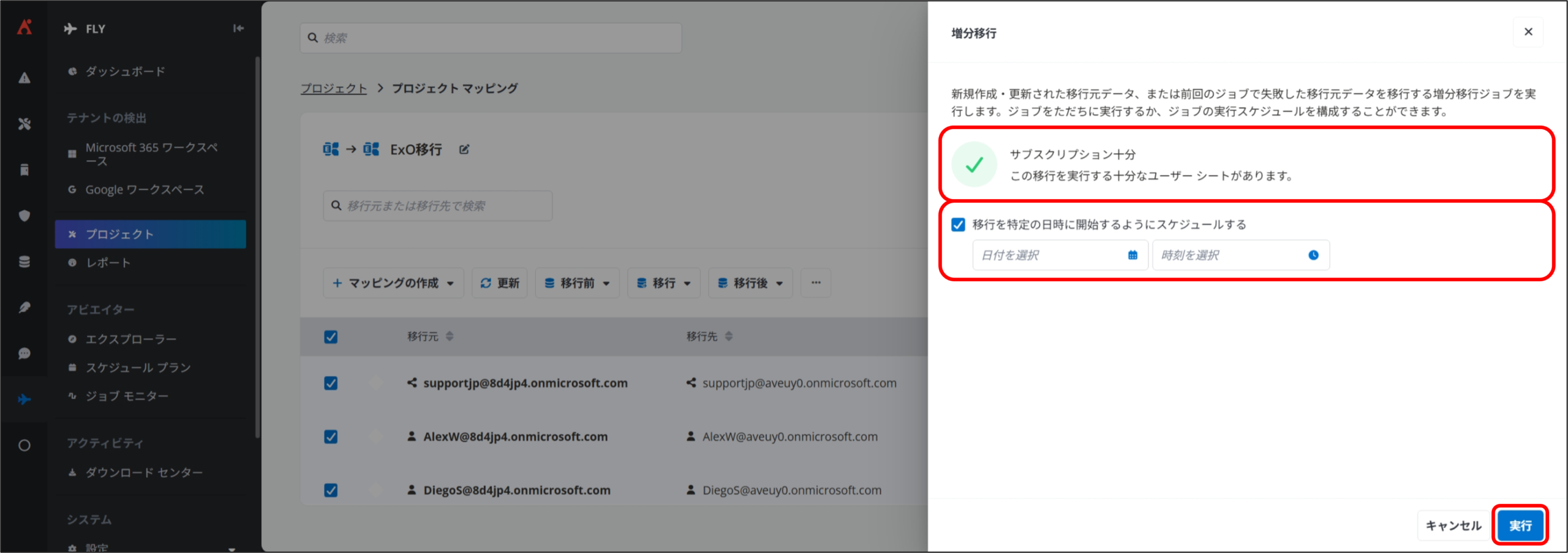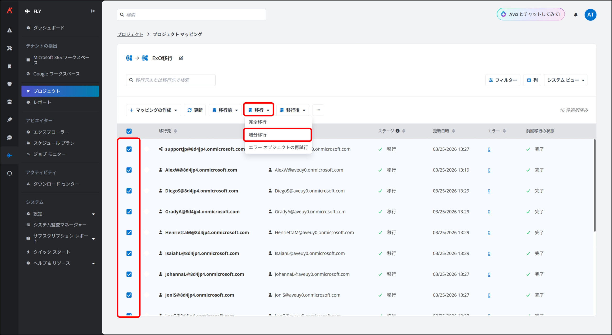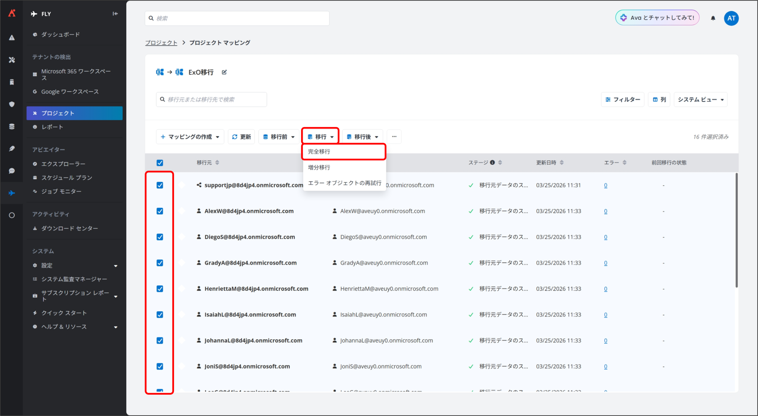 Fly では、移行準備が整ったプロジェクト マッピングに対して、「完全移行」を実行することで、実際のデータ移行を開始します。